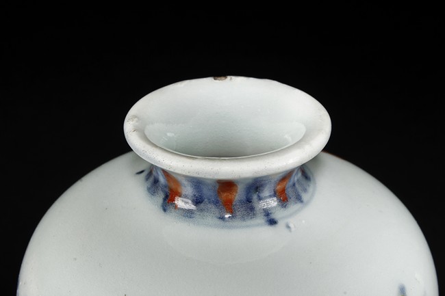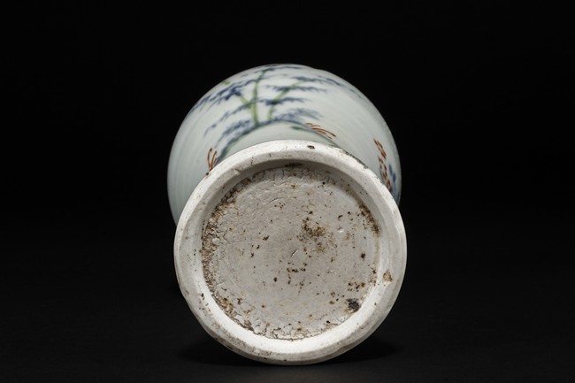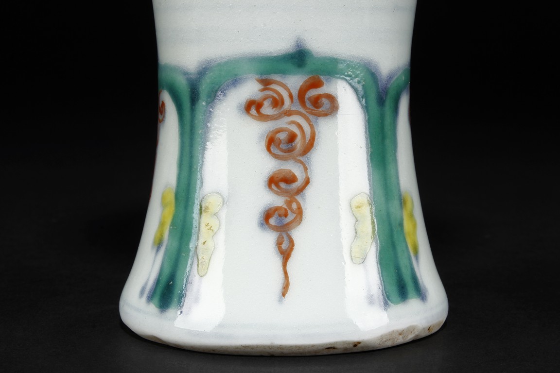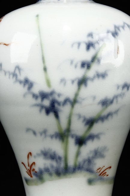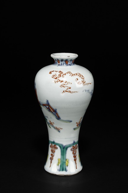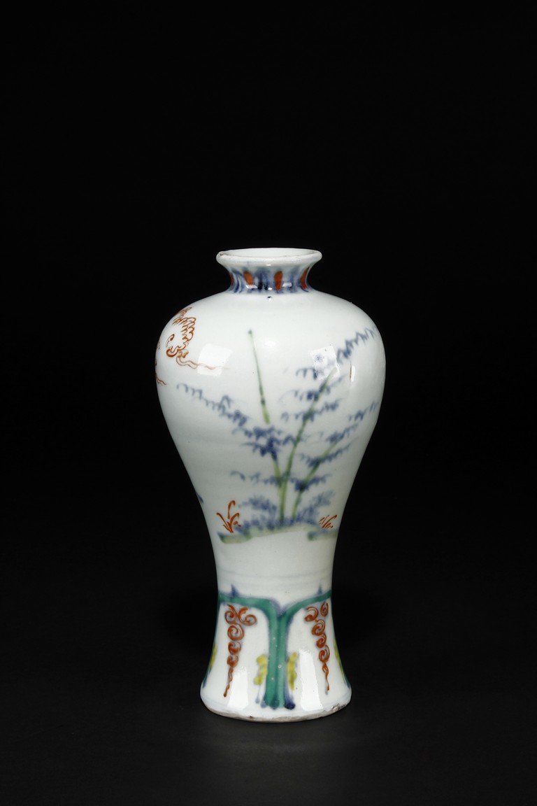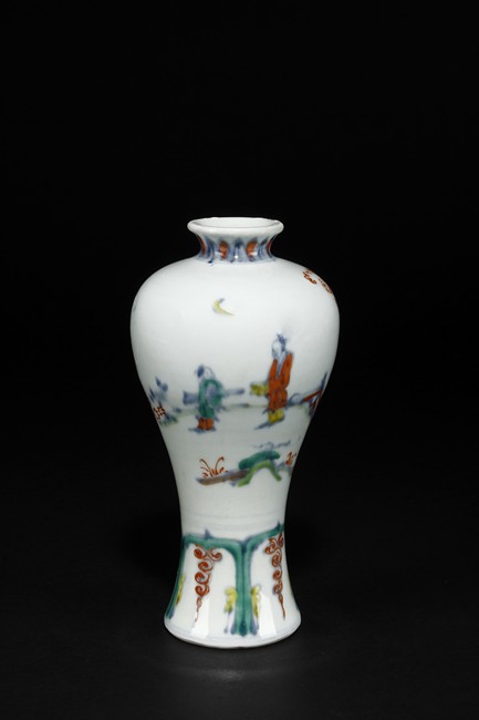 The elegant baluster body is finely painted in sancai of a man and his attendant walking past bamboo groves, with scrolling flowers and lappet patterns at bottom and neck, the bottom remain unglazed. Qing Dynasty period.