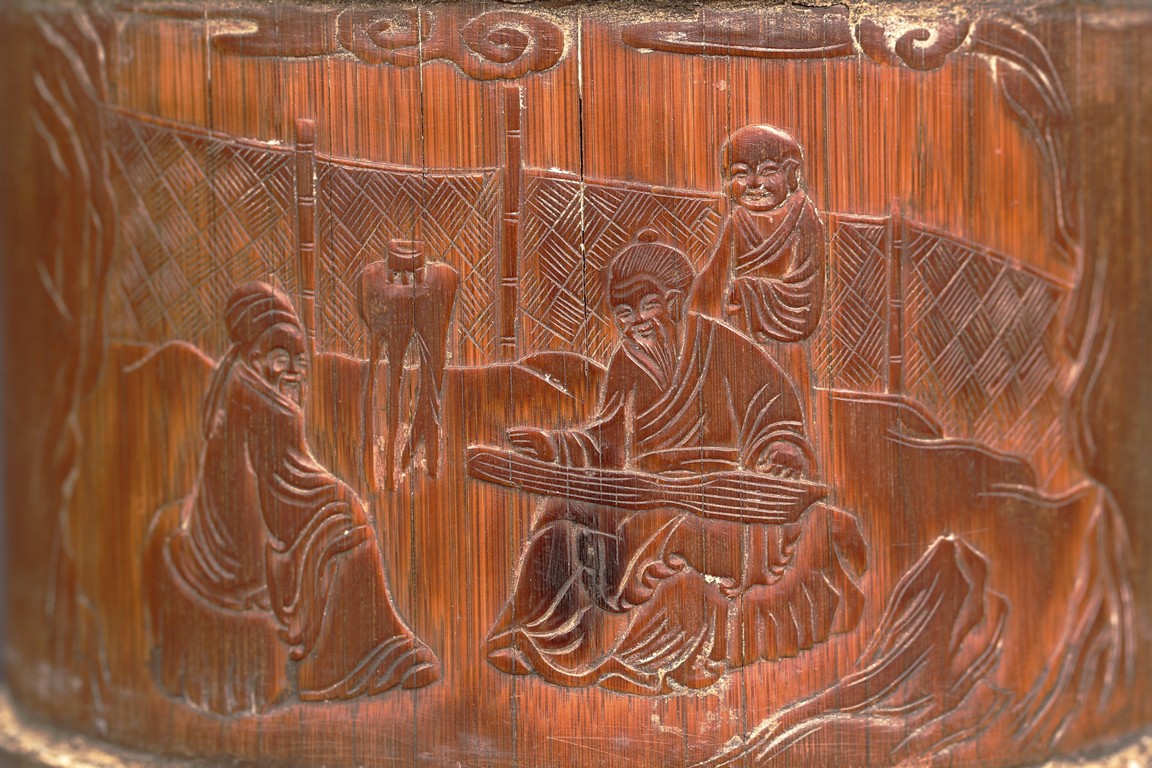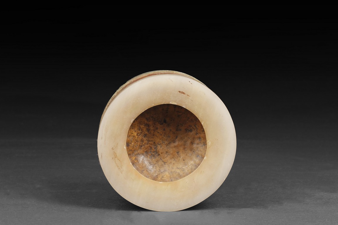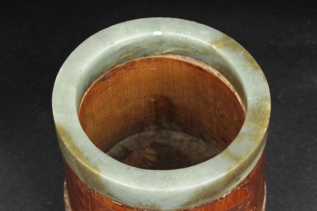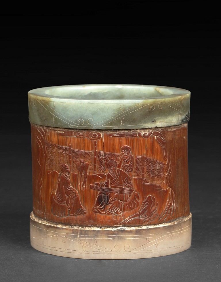 Of cylindrical form, the bamboo brush pot encased on top and bottom with jade, one of celadon color, and one of chicken bone white color, both carved with similar patterns, the brush pot carved with an elder playing Chinese musical instrument in front of a guest, while an attendant waits on the side, in a garden setting. Qing Dynasty period.