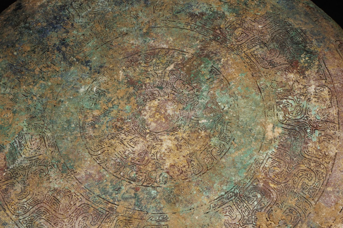 Of bulbous form, the body carved with delicate key-fret patterns, supported by three tapering legs, a pair of up rising handles applied to the sides, the cover with similar key-fret patterns and three rings attached. Age related oxidation and rust. Warring States period.