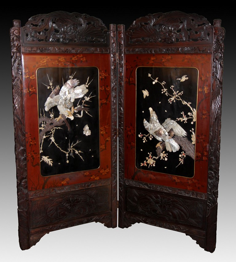 The large floor screen is composed of two separate floor screens linked in the center. The floor screen depicts two eagles, one on the branch staring down with a snake nearby, and the other on a lower branch staring up towards a bird. The scenes were created with mother of pearl, bone, wood, and other materials. The frames were low relief carved, with flowers, phoenix, and plants patterns.
