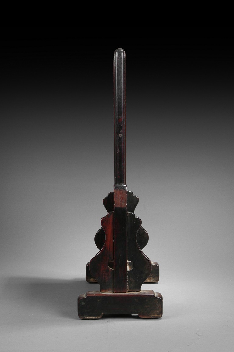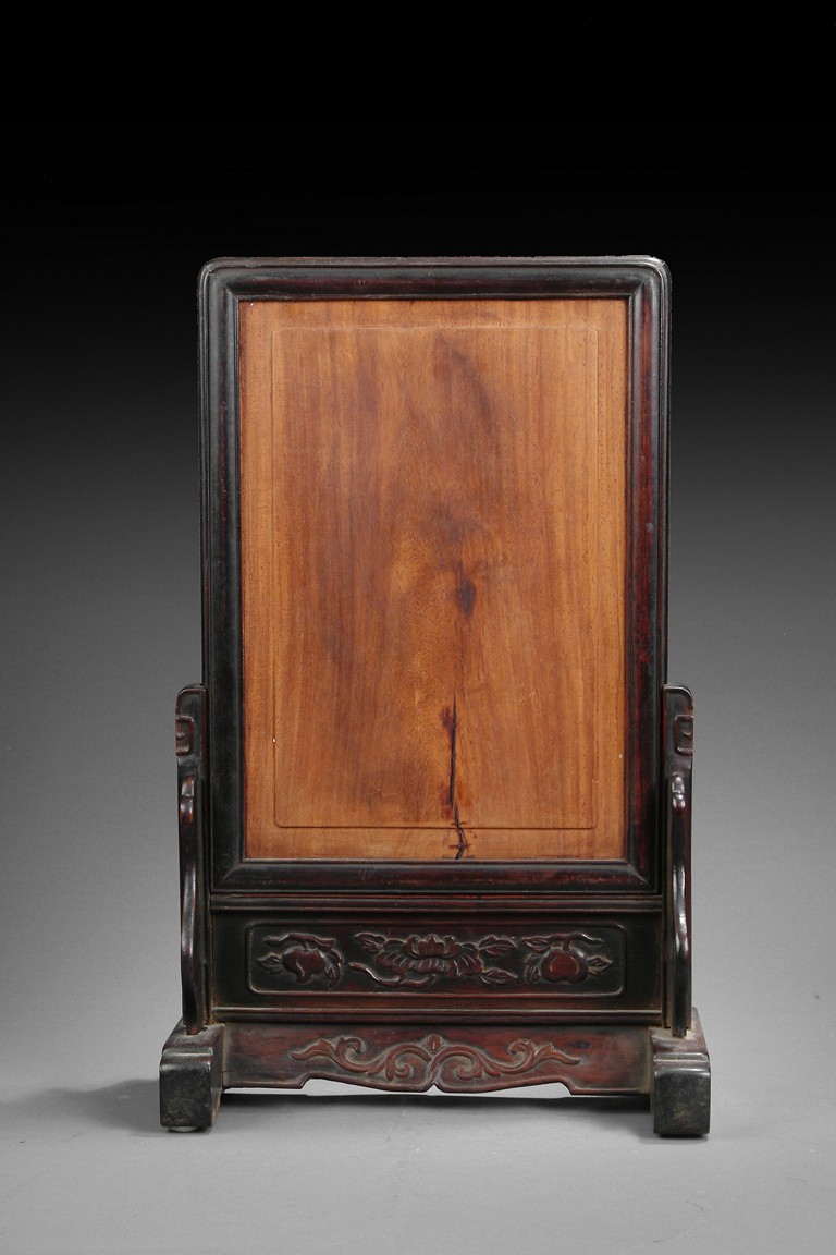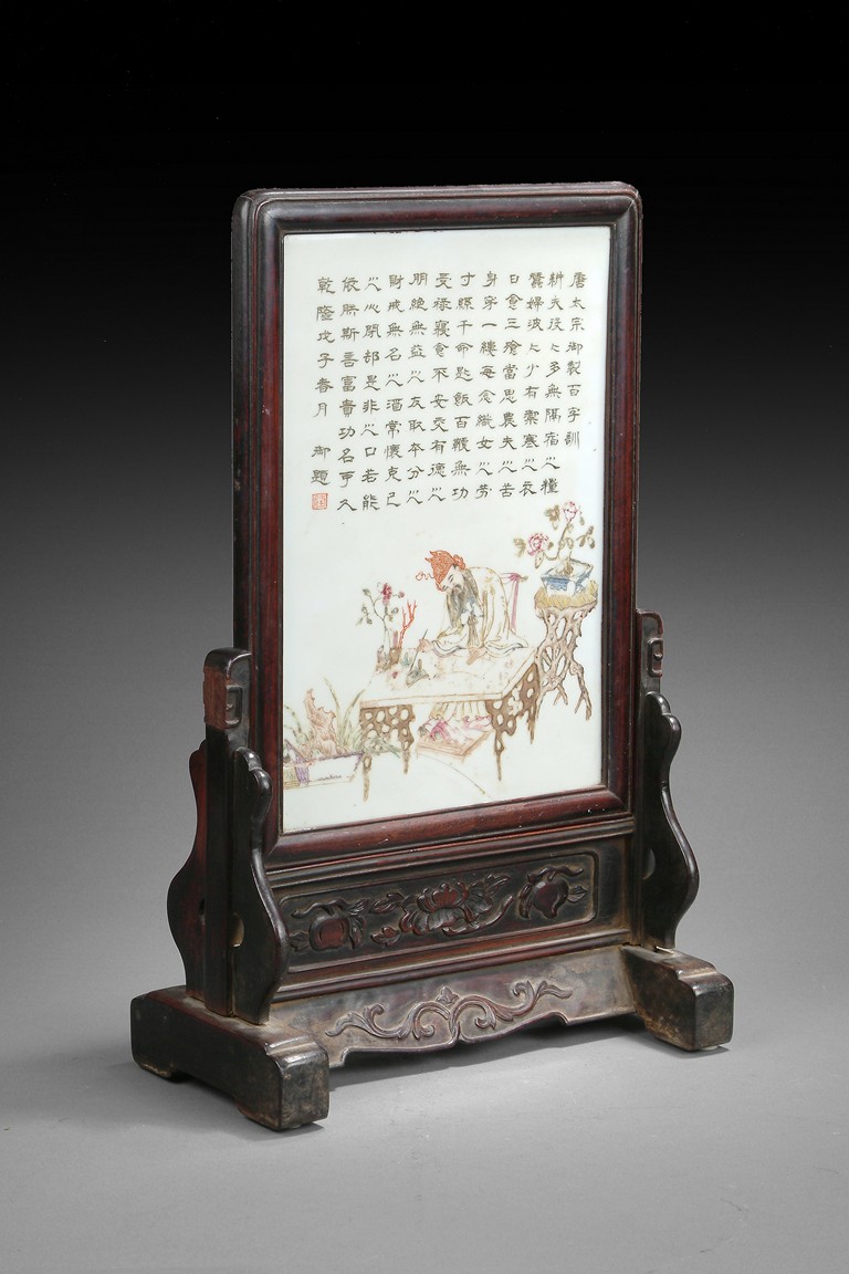 The plaque depicts a court official writing on a table, surrounded by flowers and plants. Chinese calligraphy on the top, along with seal mark. The back of plaque is supported by wood, and framed overall by hardwood stand with light carvings. Qing Dynasty period.
