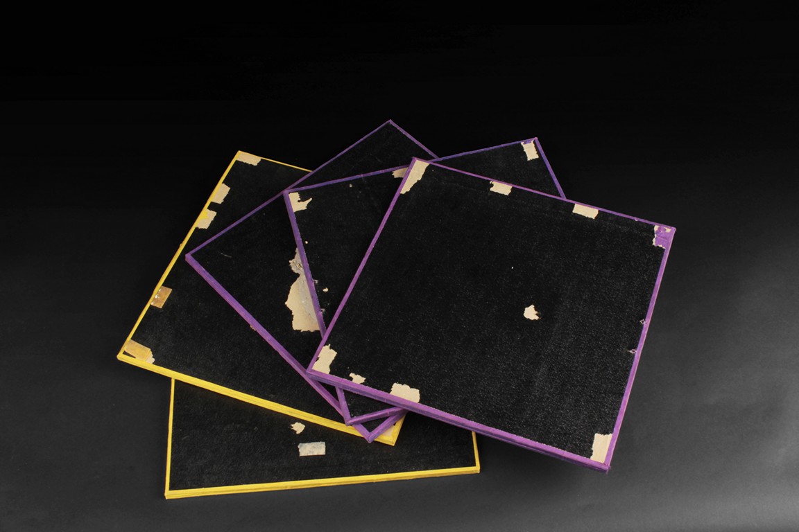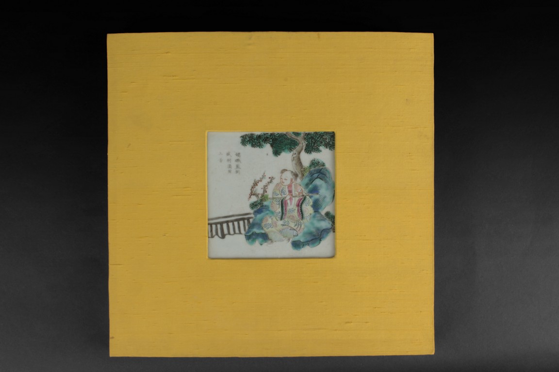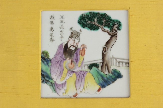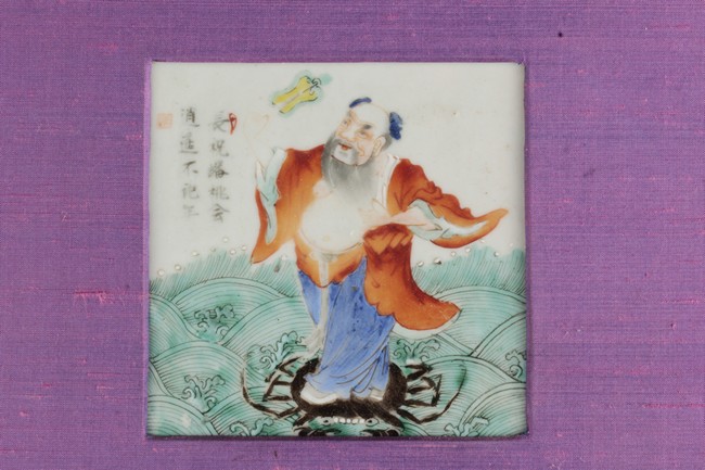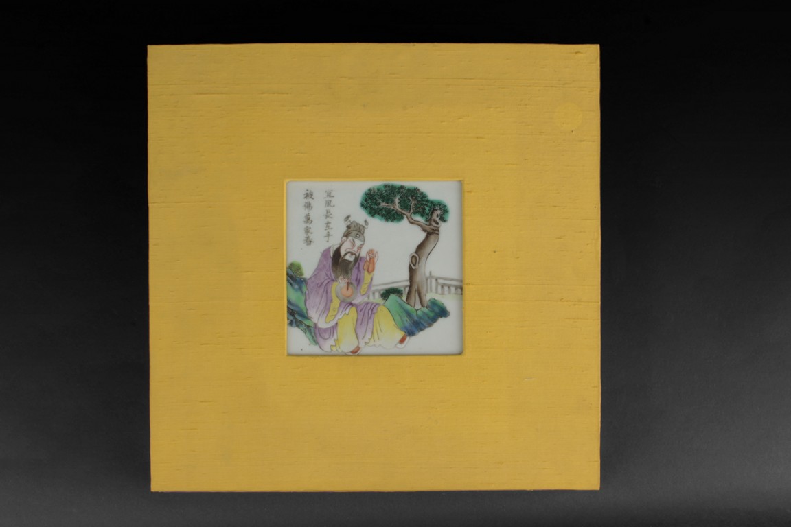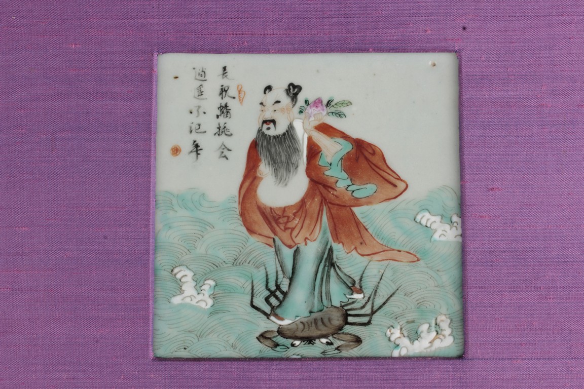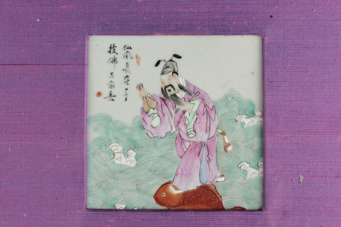 The group include five Doucai porcelain plaques embedded in thick paper frame, each depicting different Immortal in garden and ocean settings, with a Chinese verse and artist mark on the side. Qing Dynasty period.