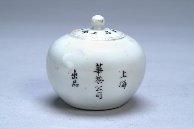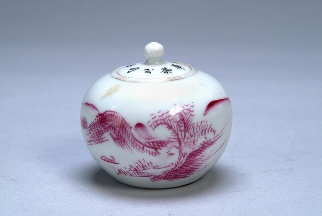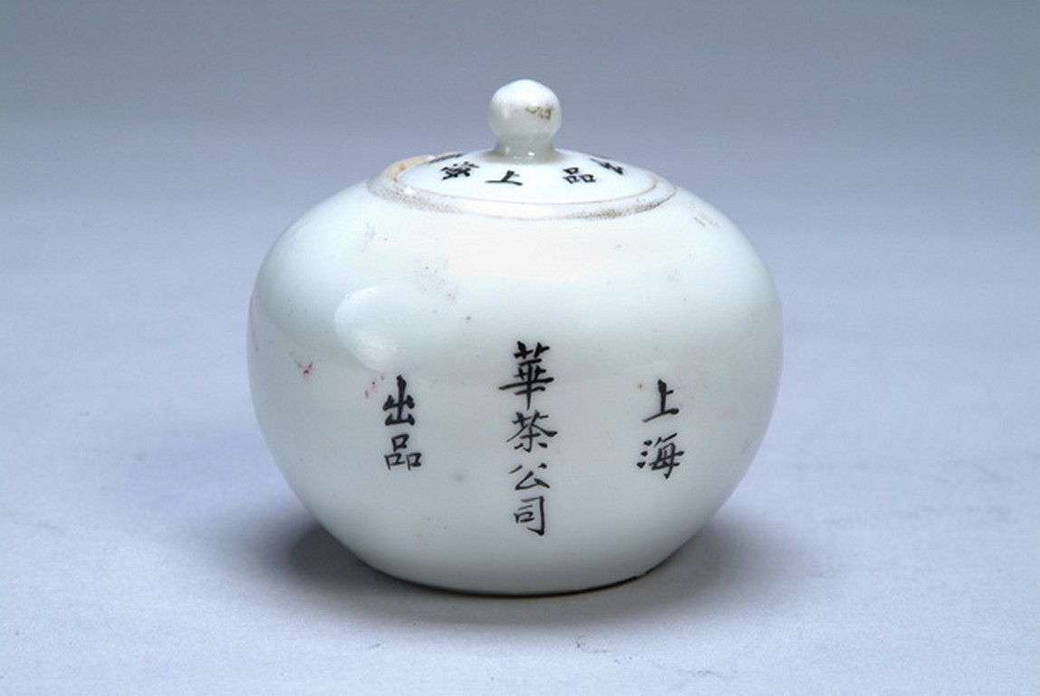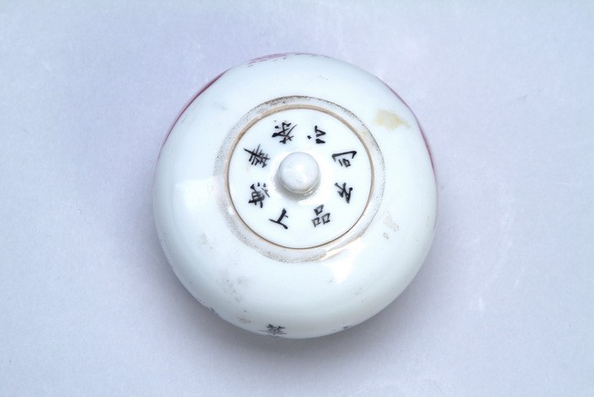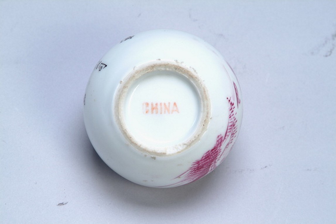 The body painted in red with landscape scene and chinese inscriptions mark (made in Shanghai Huacha company), the cover with similar mark. The bottom bears a CHINA mark.