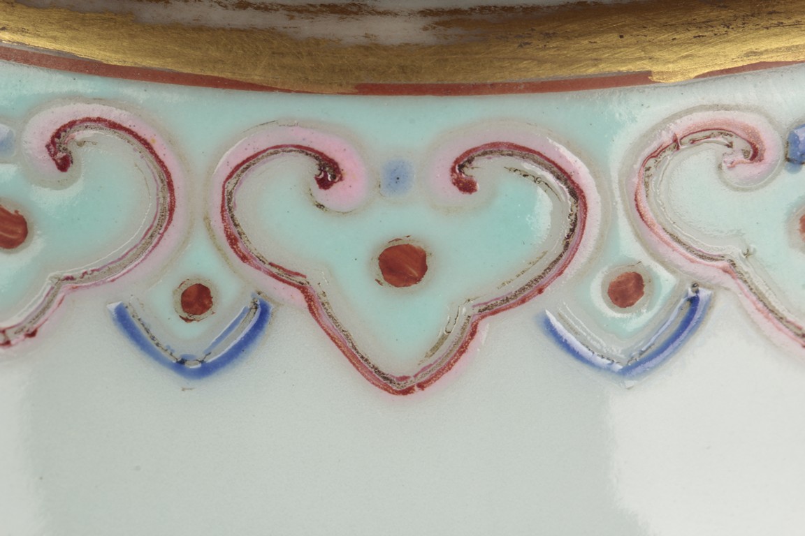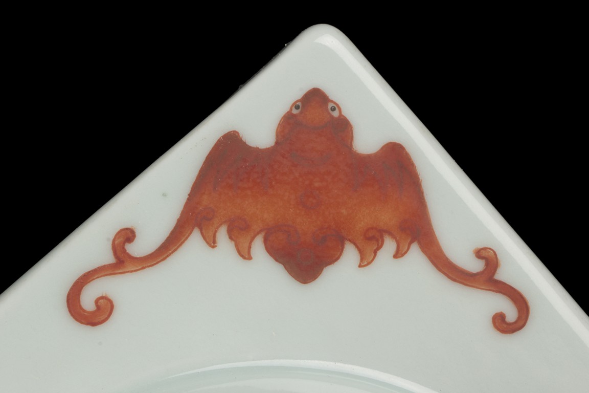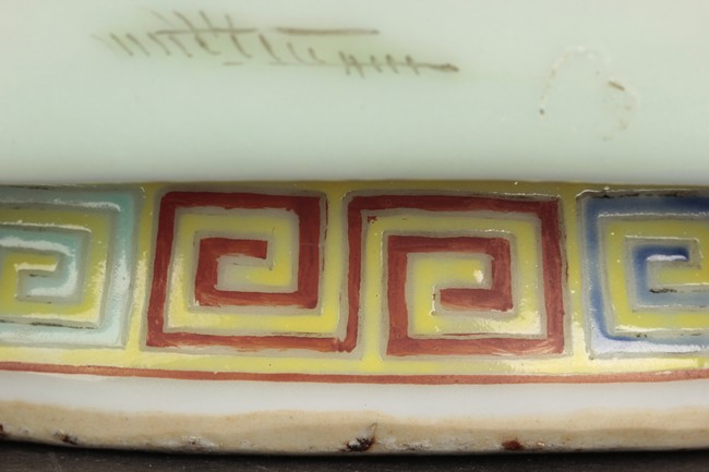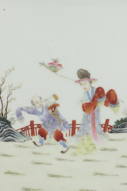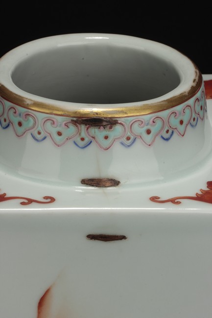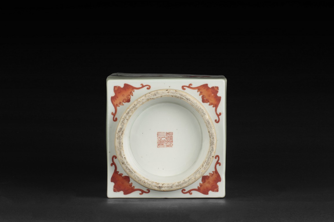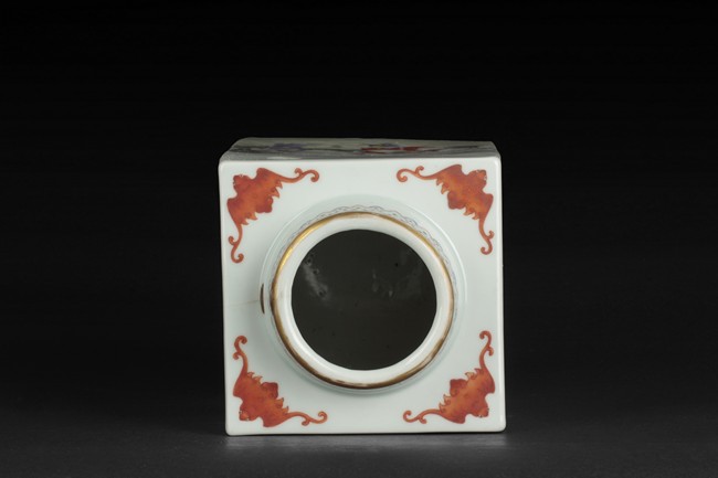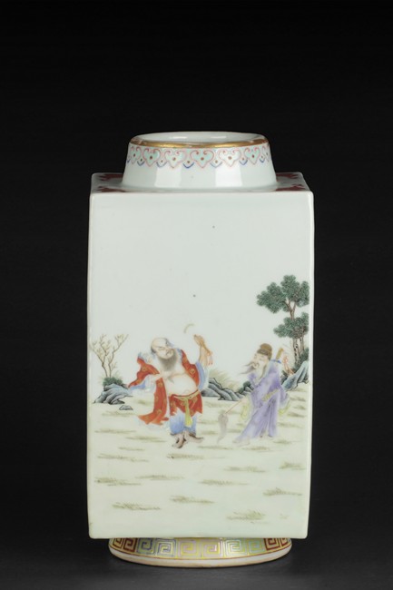 Of rectangular form, each side of the exterior painted with two Immortals in garden setting, the ring foot with key-fret patterns, shoulder with a bat in each corner, and neck with Ruyi head patterns; bottom bears six characters'QIANLONG' mark. Repairs on the neck/rim. Qing Dynasty period.