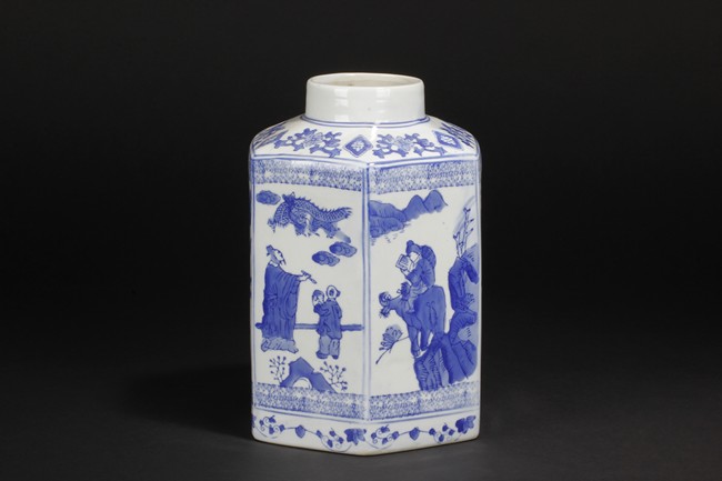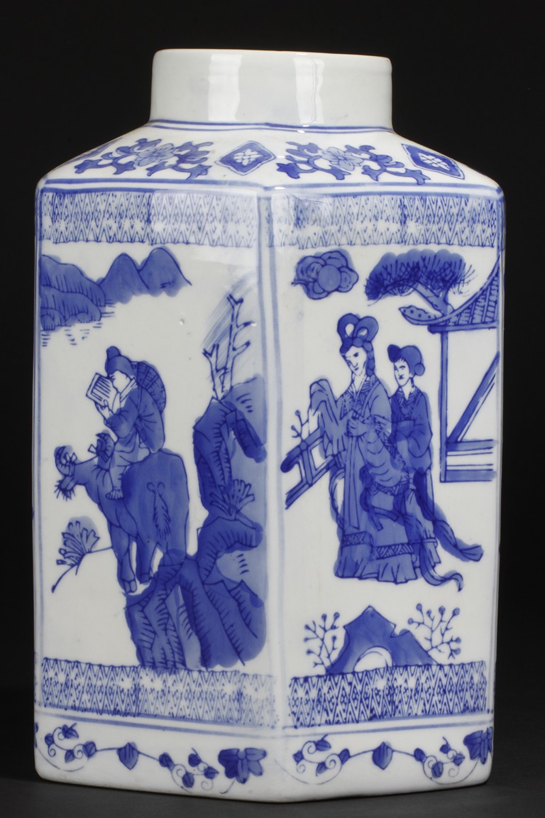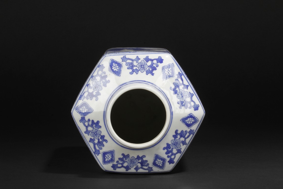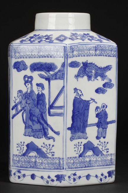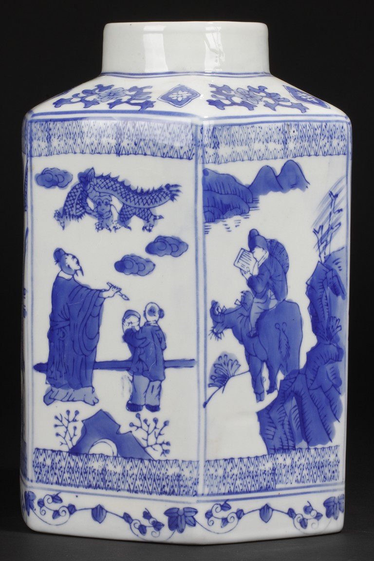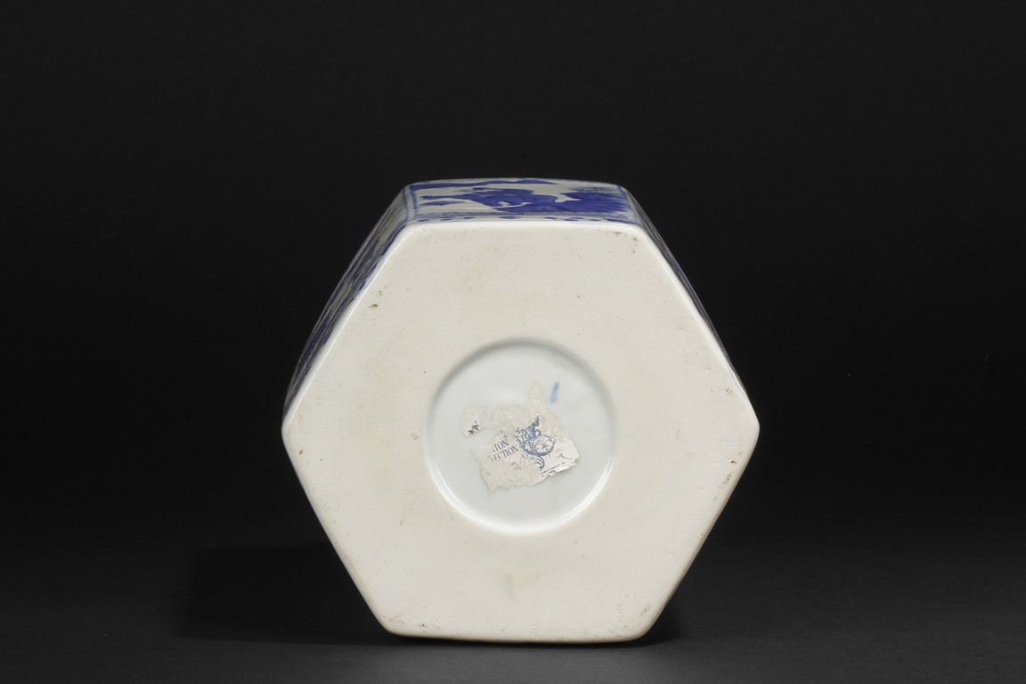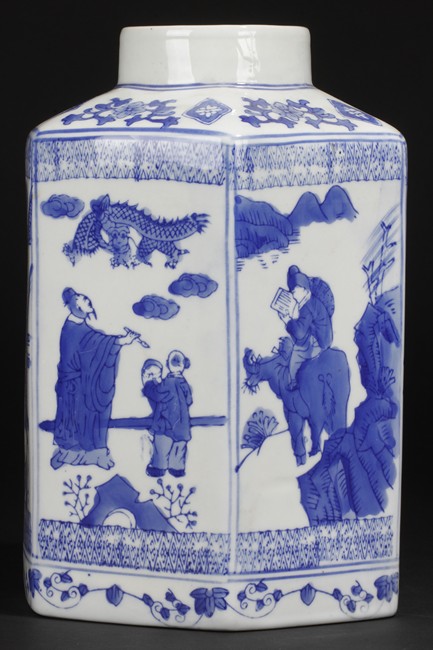This blue and white jar is in the hexagonal shape, depicting 3 sets of two identical motifs, an older man drawing a flying dragon with a boy in a garden, a boy reading a book on the back of a buffalo in a mountainous scenery, a lady with her maid walking in the garden.