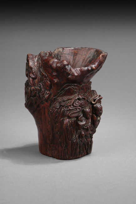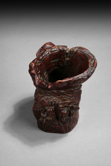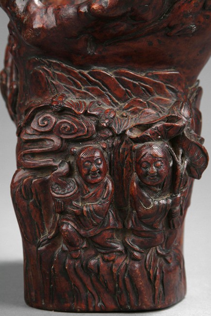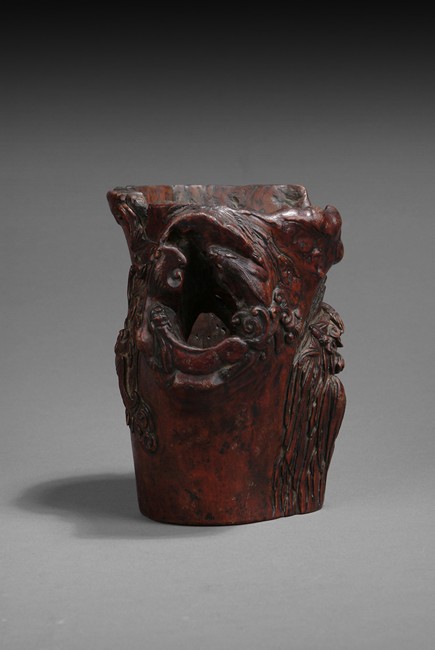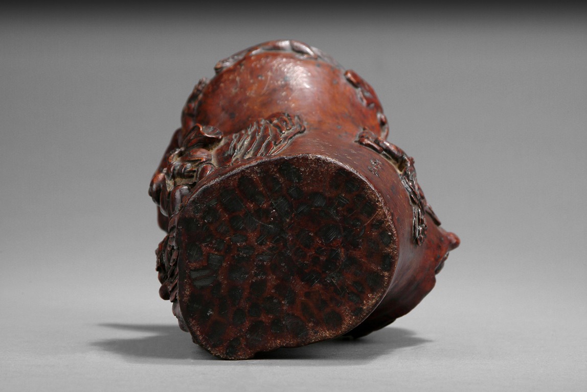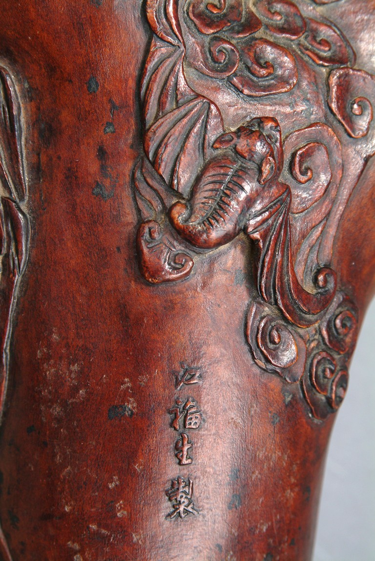 Intricately carved iron wood root brush pot that depicts of a tree trunk, well hollowed and carved in relief with two Immortals He-He on the front, one carrying lotus leaf while the other carrying a box, with bats flying, symbolizing long lasting marriage. Artist mark'JIANG FUSHENG' on the side. Ming/Qing Dynasty period.
