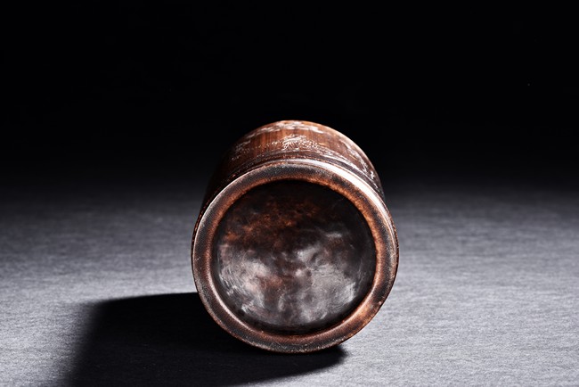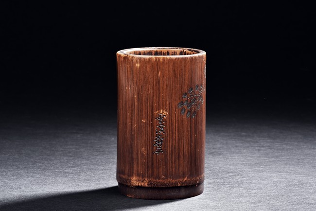 A BAMBOO CARVED FIGURES BRUSHPOT 清 竹雕刻人物帶款筆筒