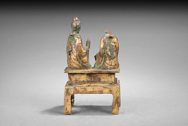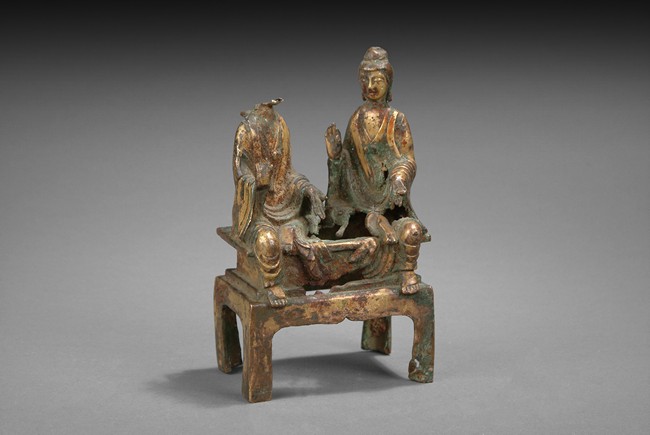 The two Bodhisattva seated in Lalitasana on a rectangular plinth, each wearing loose robe and holding different mudra. Missing one Bodhisattva's head. North Wei Dynasty period.