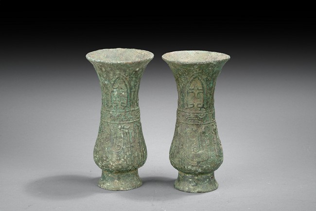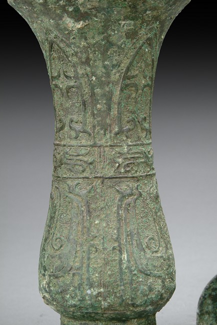 The bottles stands on high foot ring, with long waisted neck and everted rim, the body depicts flying phoenix and other mythical creatures, accompanied by archaic patterns. West Zhou Dynasty period.