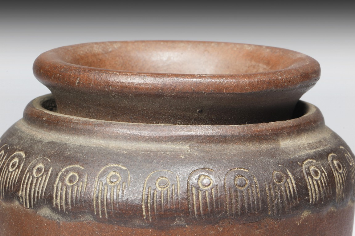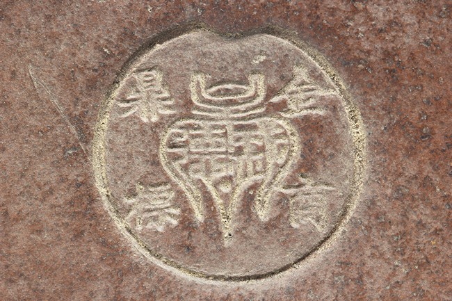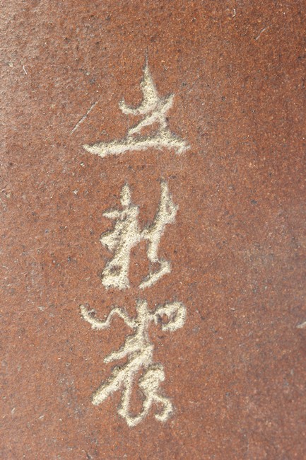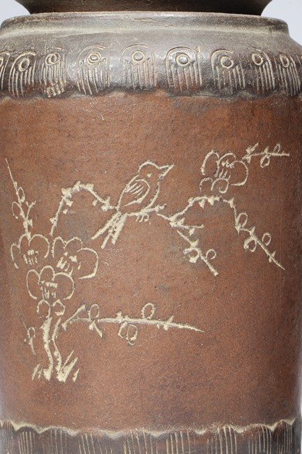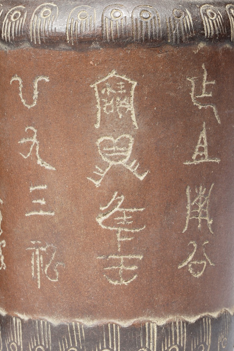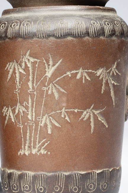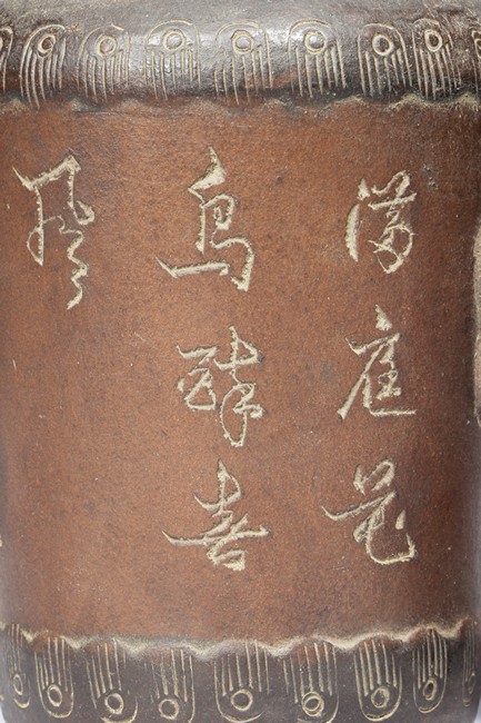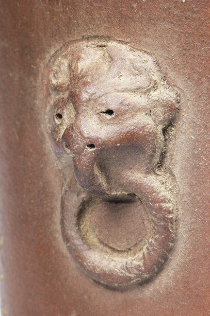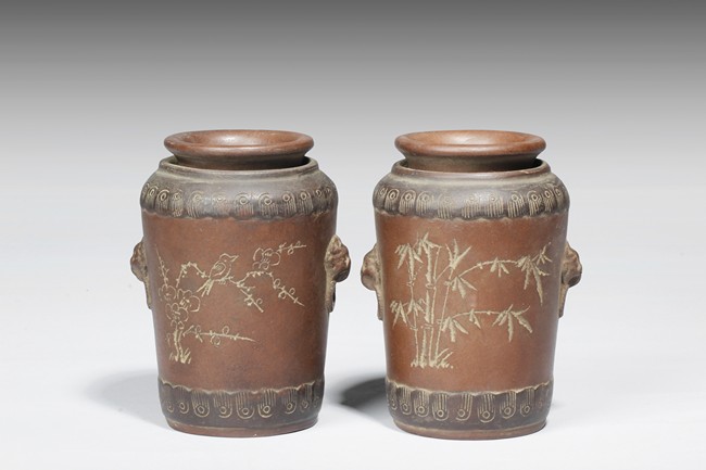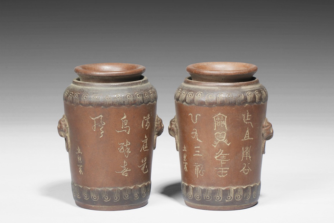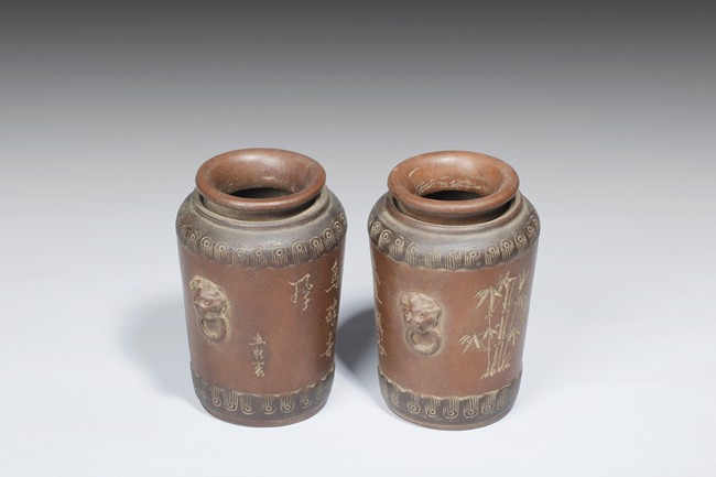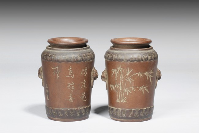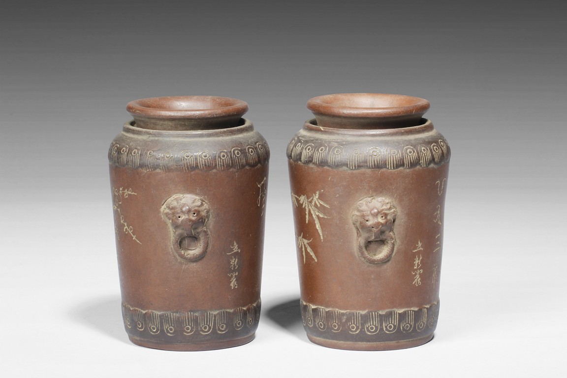 A pair purple clay vases in cylindrical form, the body incised with Chinese characters in different styles, the sides with lion mask handles, and the back with bamboo and flowers. Bottom bears four character'Jin Ding Shang Biao' mark. 19th century.