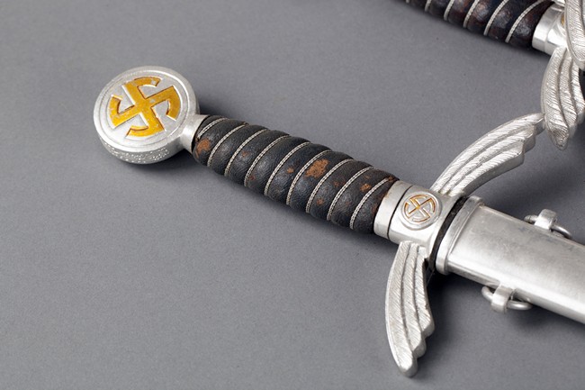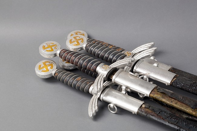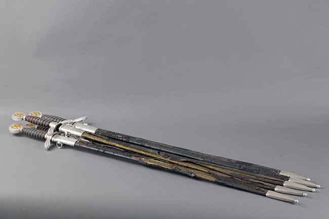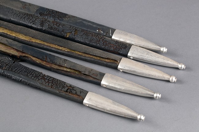 All five swords are of similar style, including the sign on the pommel, leather scabbard, and silver handles.