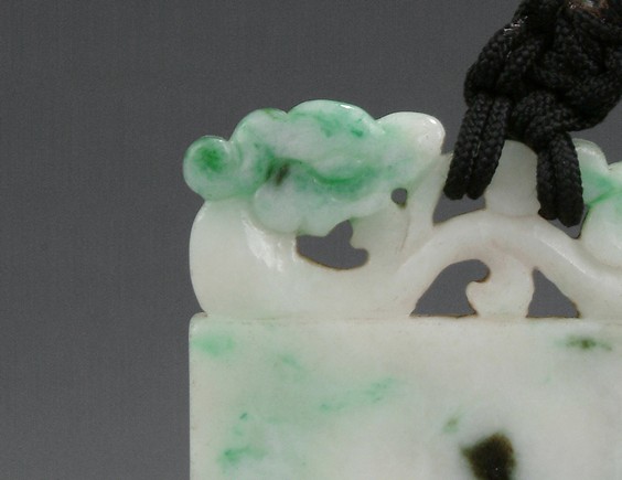 The well carved Chilong stands on top of the pendant, head turned back; russet of spinach green and light green scattered prominently over the whole pendant. Republic period.