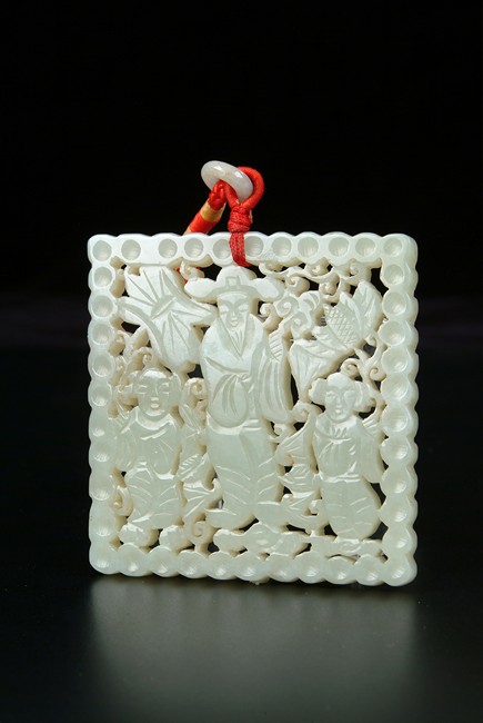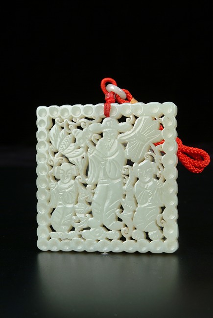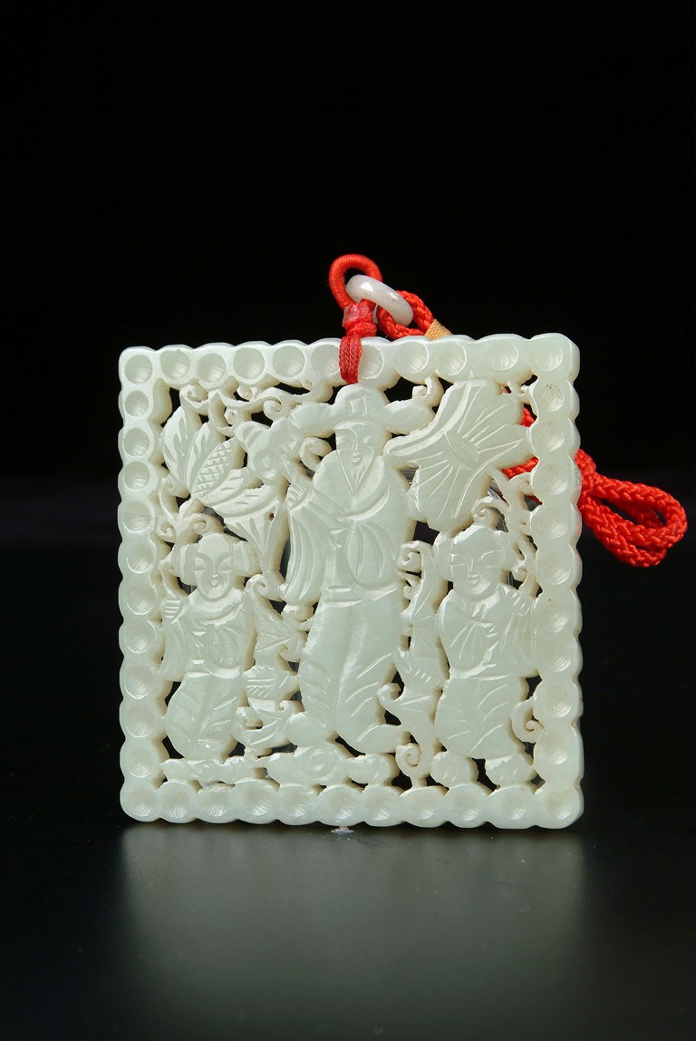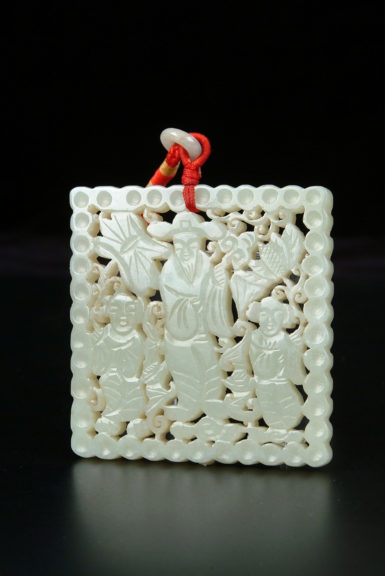 A CELADON JADE PENDANT    清 玉鏤空雕人物掛牌