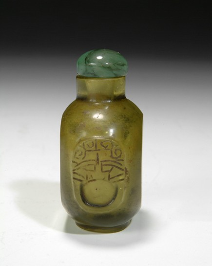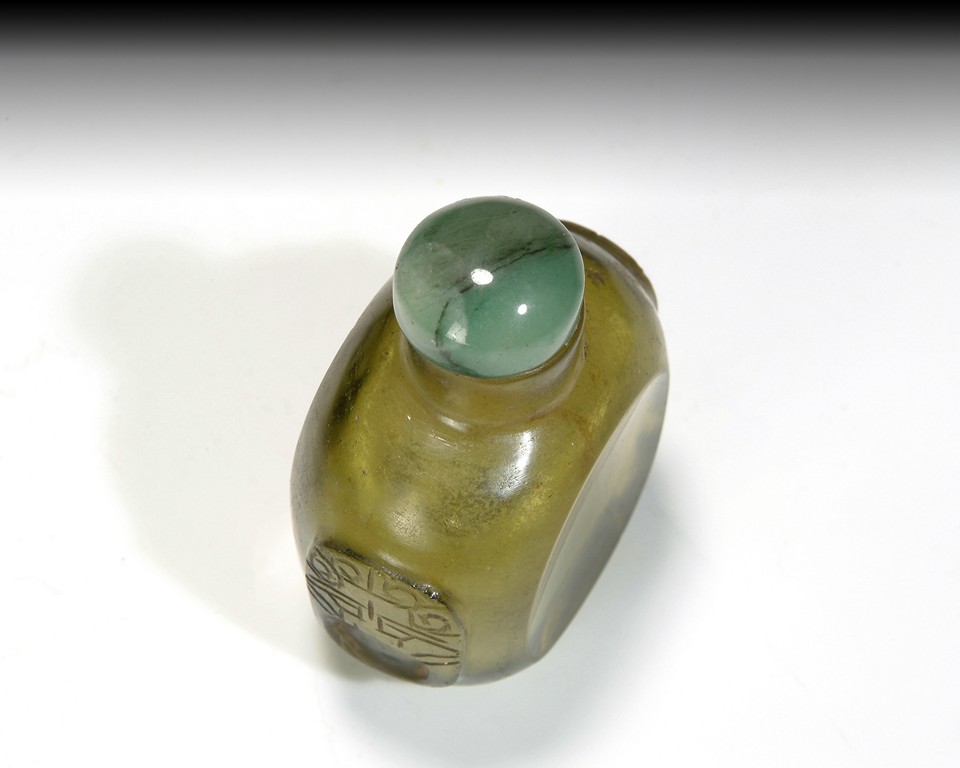 A glass snuff bottle topped with a hard stone stopper. Republic period.