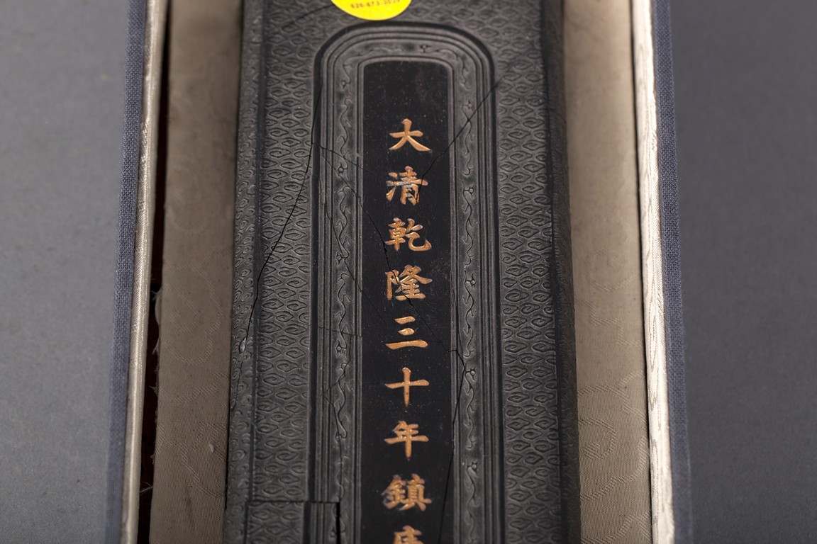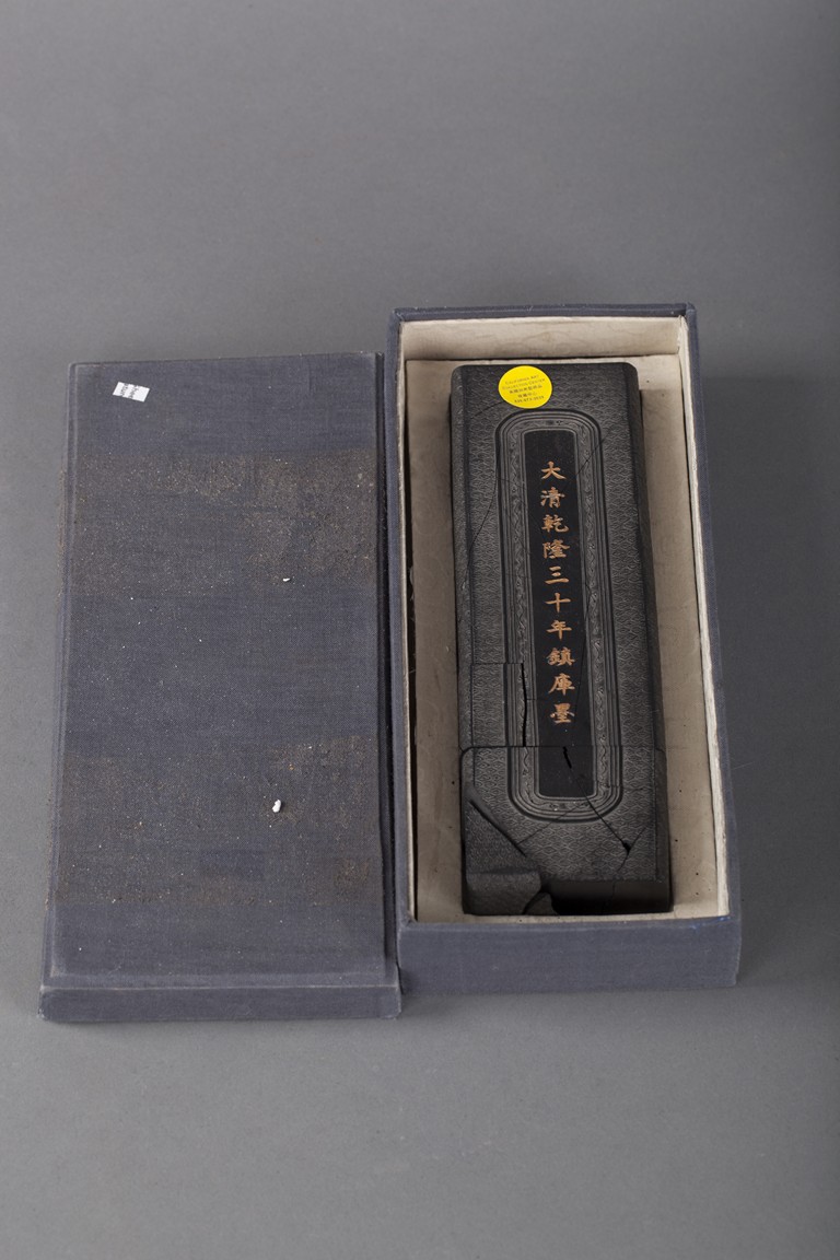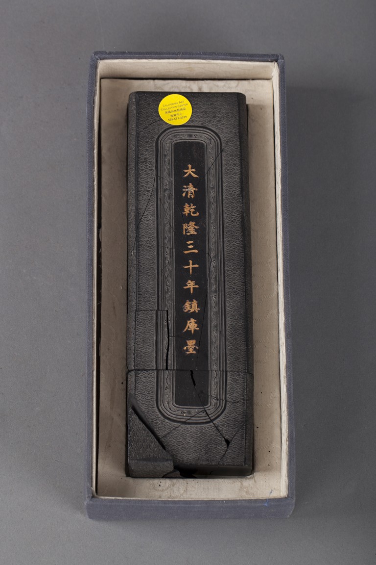 Of rectangular form, the ink stick with golden Chinese characters on the front, along with wave patterns. The ink stick is broken into multiple pieces.
