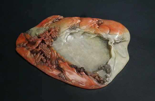 A delicate brush washer carved in relief depicting a mountainous scene, comprising two elders under a pine tree leisurely taking a walk towards a small cottage on the far right. The stone's darker tones were cleverly utilized to emphasize the subjects. Republic period.