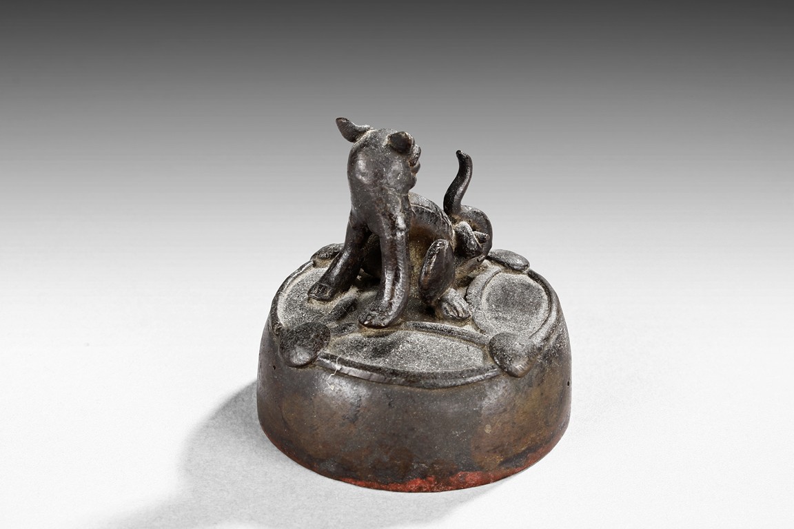 Of circular section, the bronze seal is mounted with a model of mythical beast with its head turning back, the tail curled upwards. The seal mark is cast at the bottom. Ming Dynasty period.