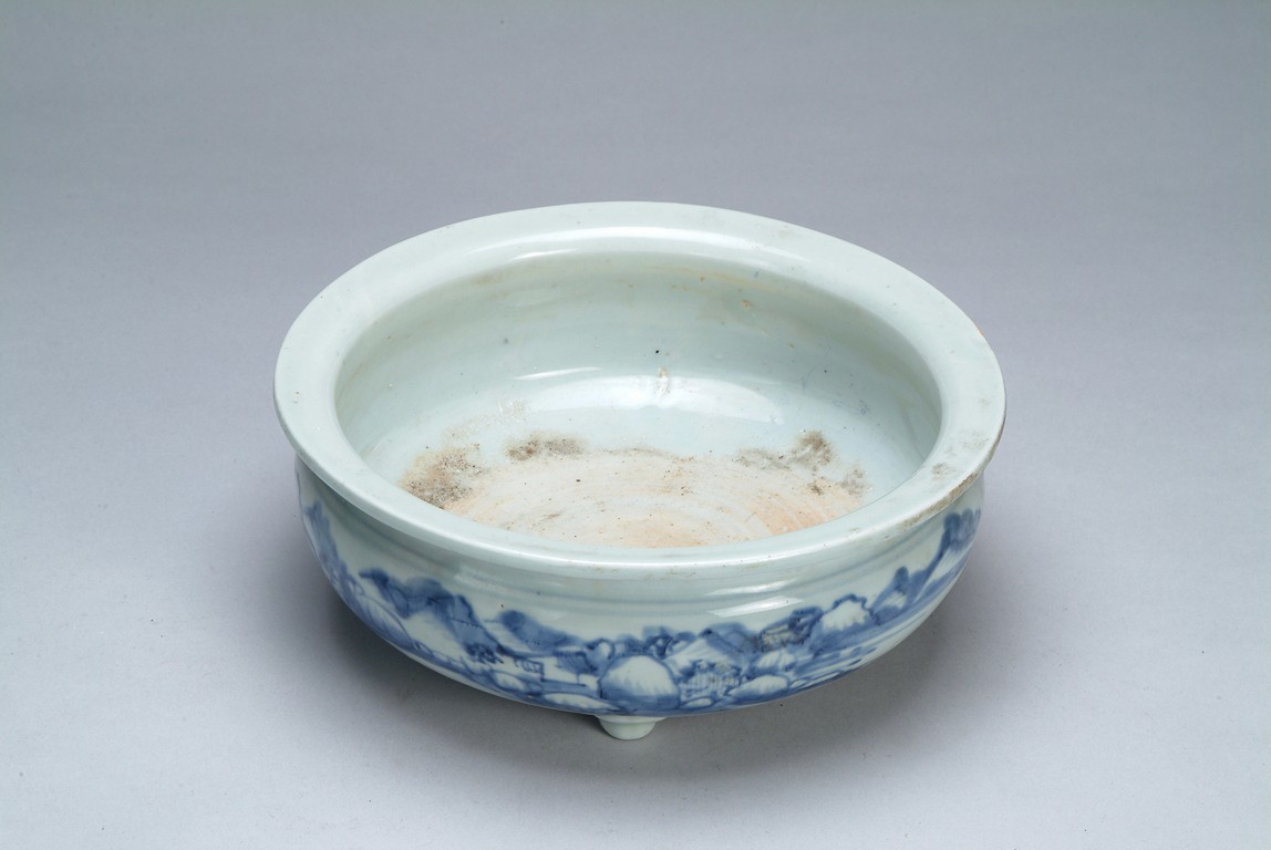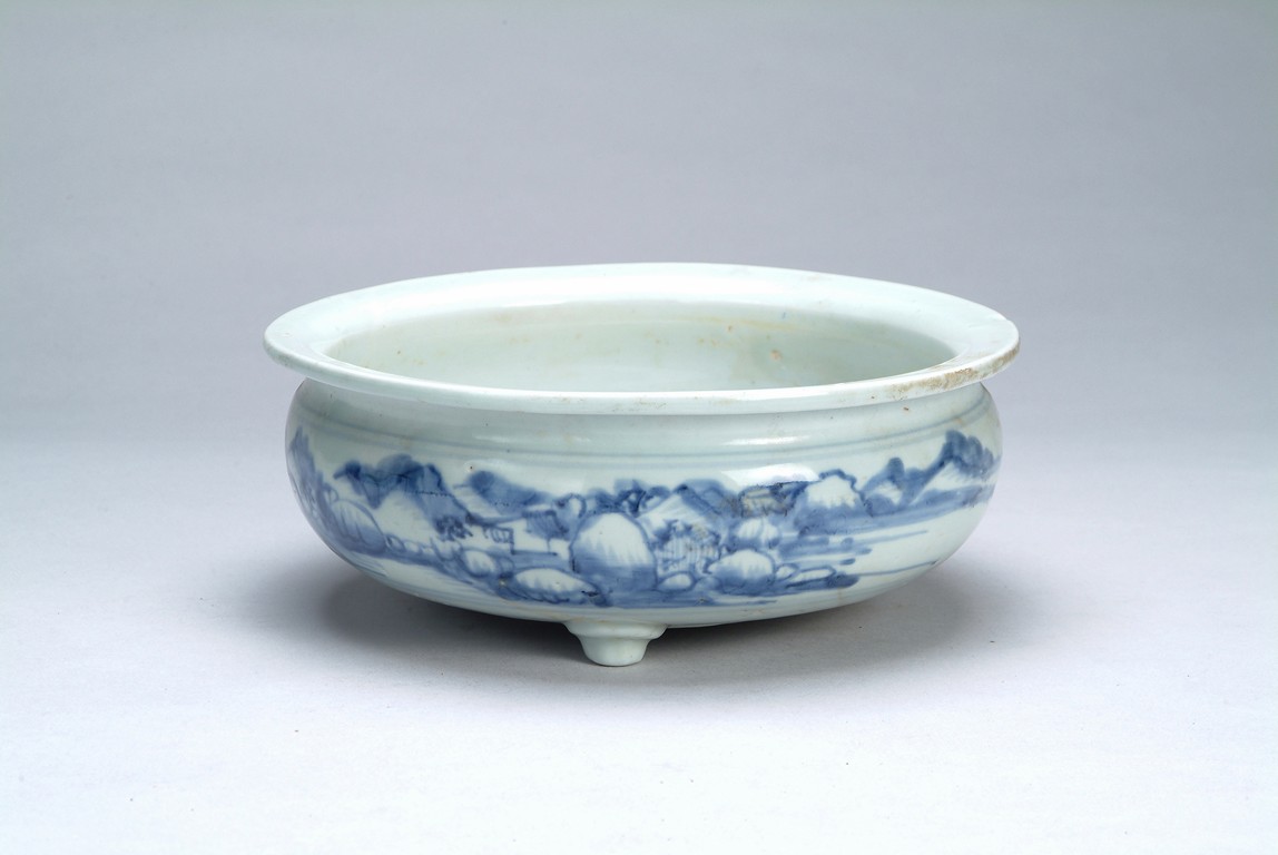 Of flattened globular form, supported on three short legs, the blue and white censer has a scene of water, village, and mountains on the body. Qing Dynasty period.