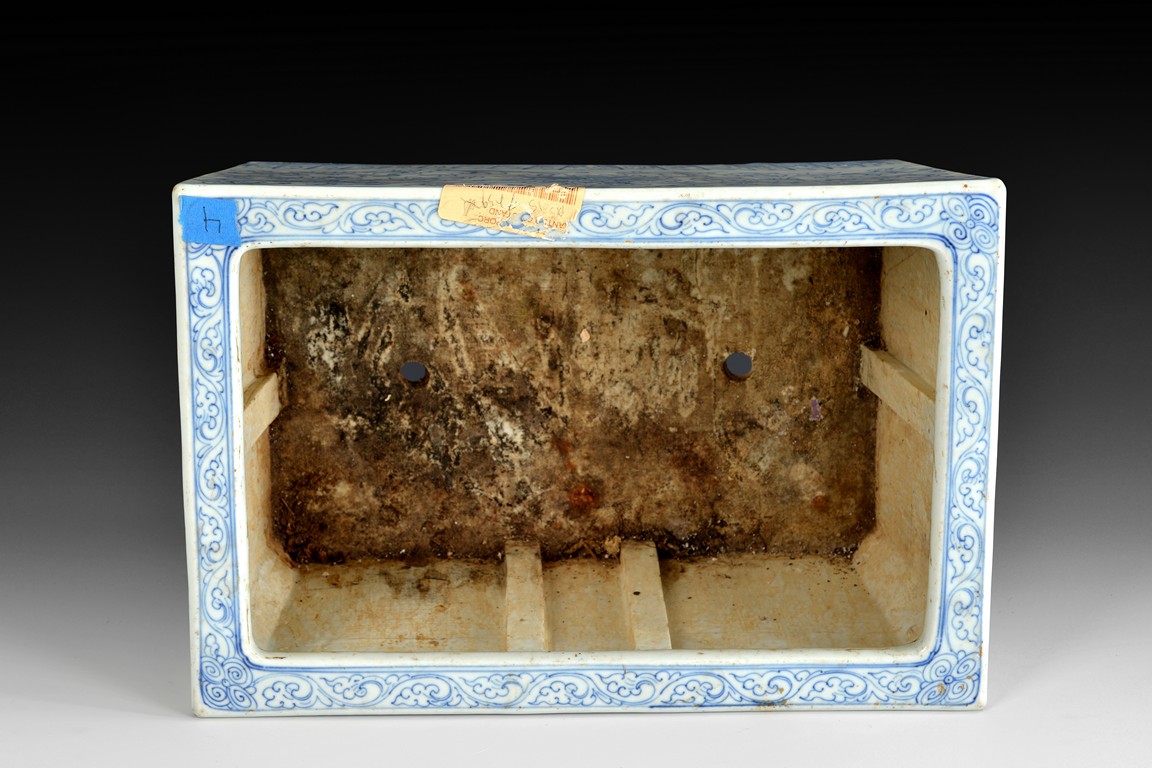 A good sized underglazed blue flower pot with tapered wall and rest on four corner legs. The sides has flower and vine designs, while the rim and bottom have intricate patterns. Qing Dynasty period.