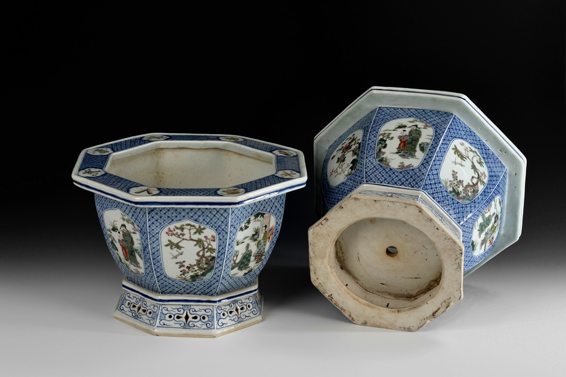 A pair of blue and white planters accentuated with famille rose design of figure and blooming flowers in a garden setting. The pot has a wide rim, decorated with the Buddha's eight treasures. Republic period.