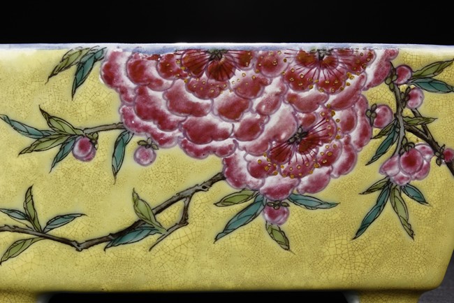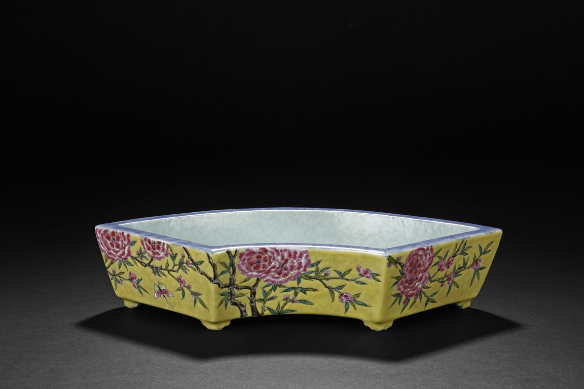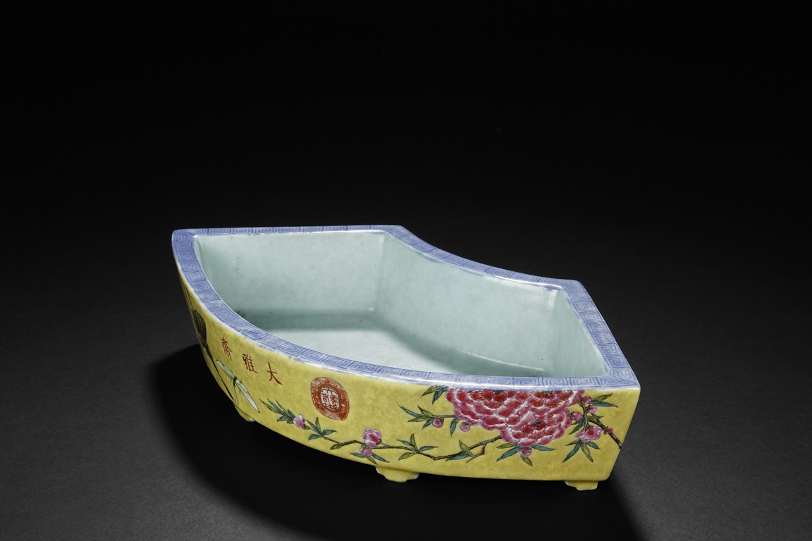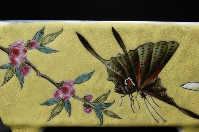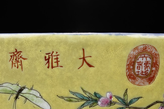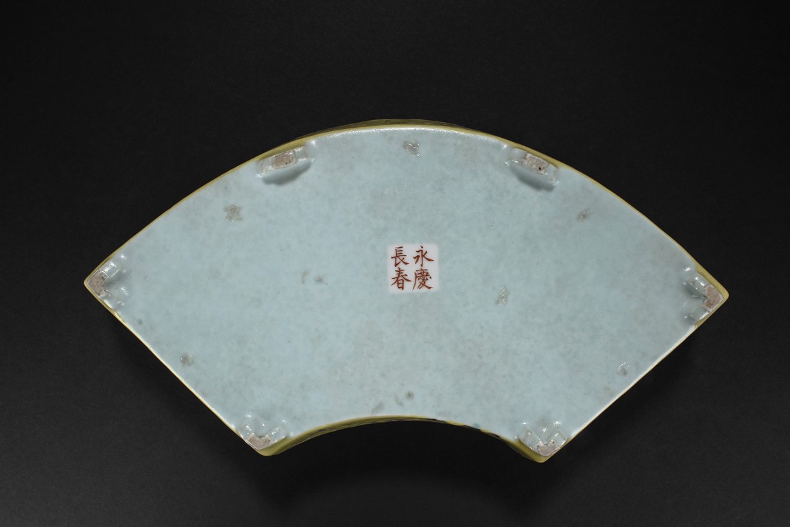 Of curved fan shape, the dish's interior glazed in teal, the sides depict butterflies amidst peony flowers against yellow glaze and crackle patterns, with artist mark'DA YA ZHAI' at center, the bottom with four character mark.