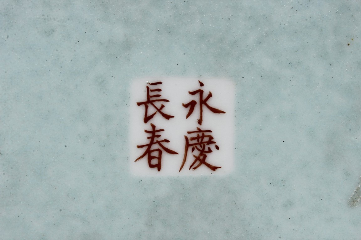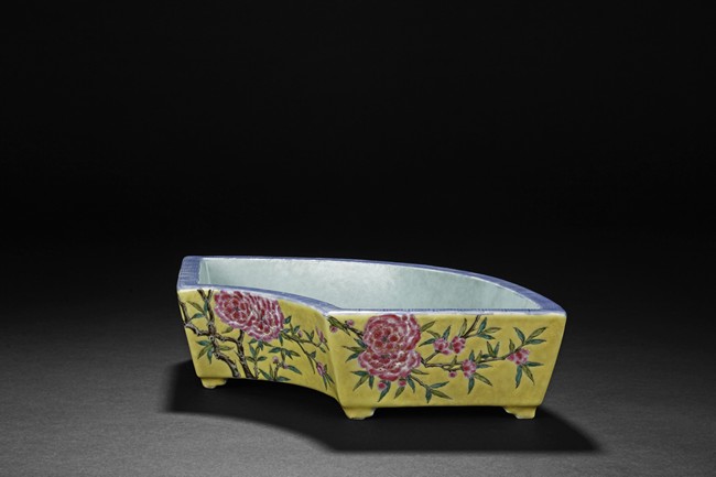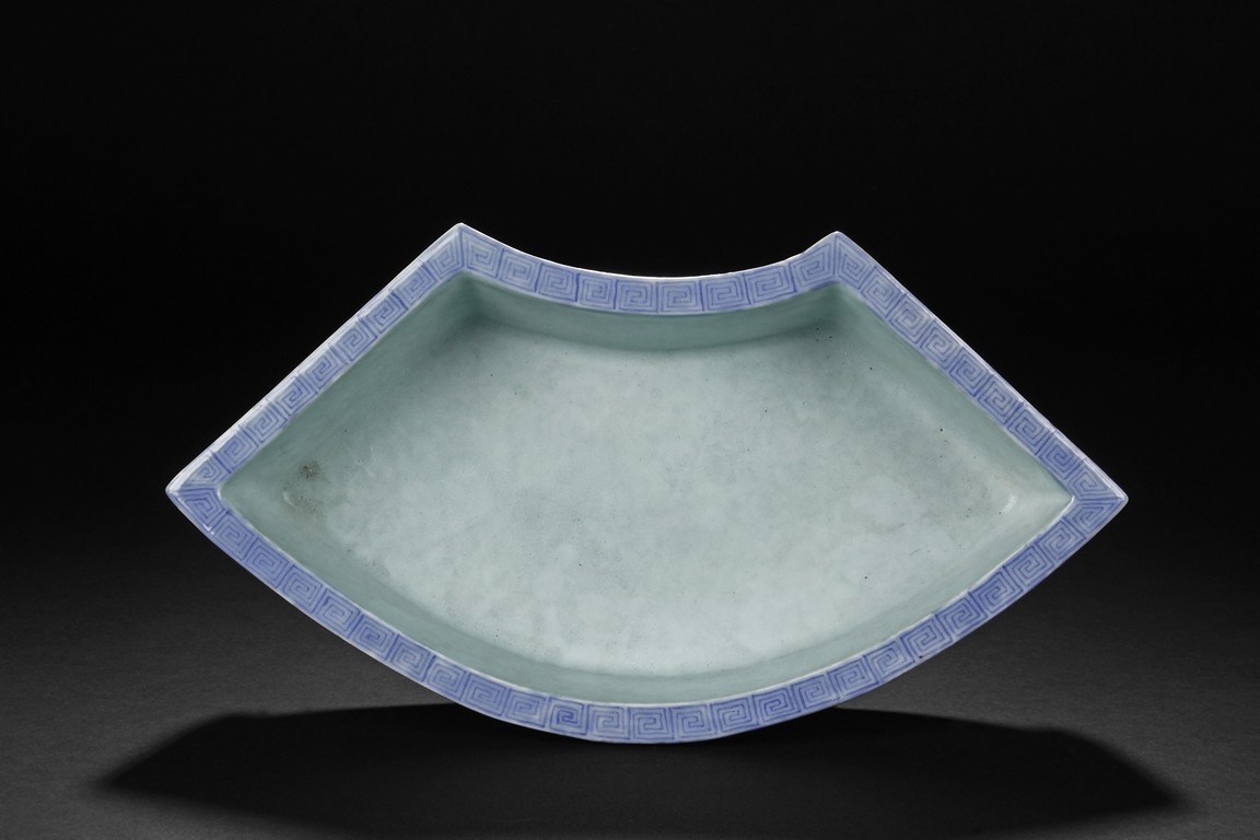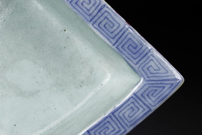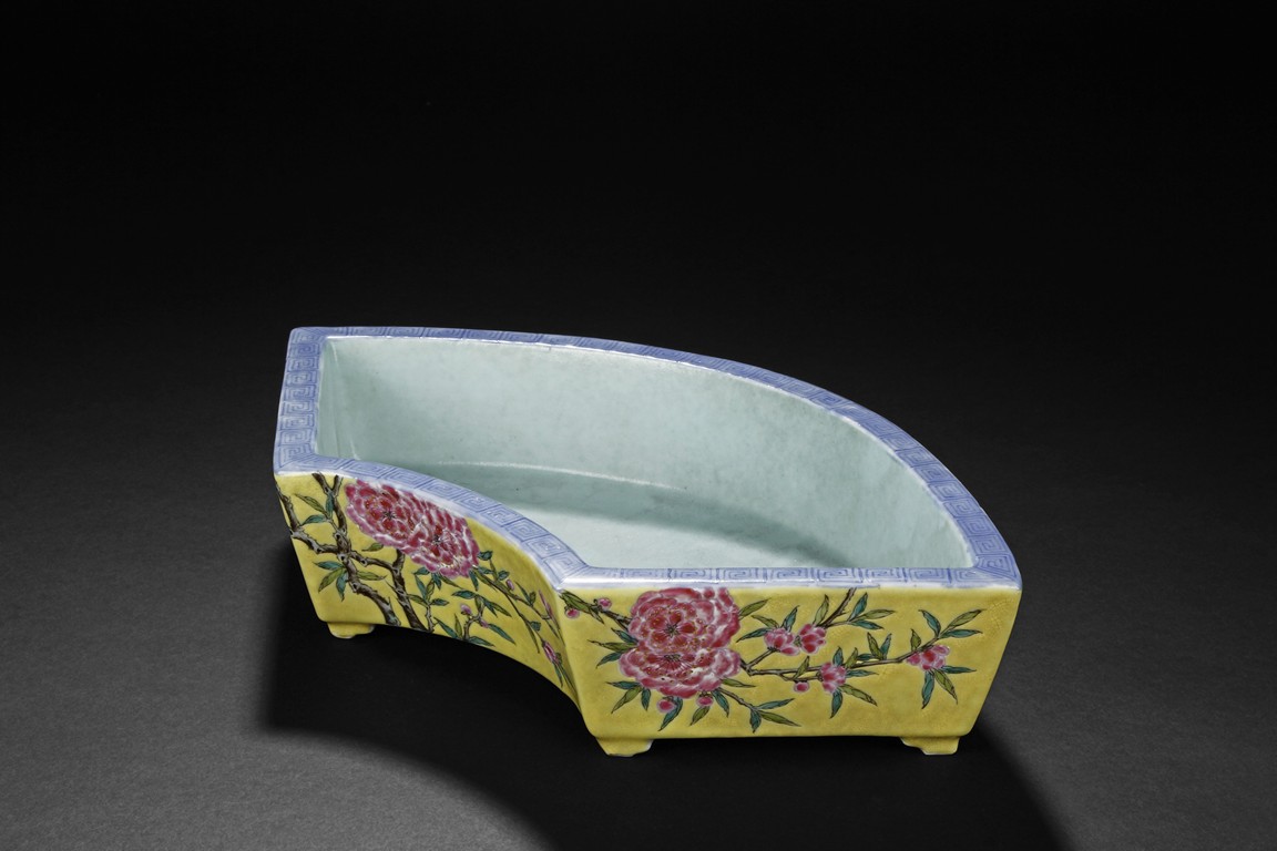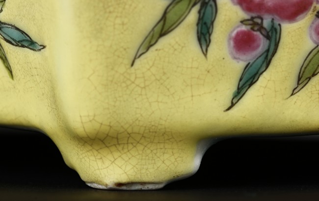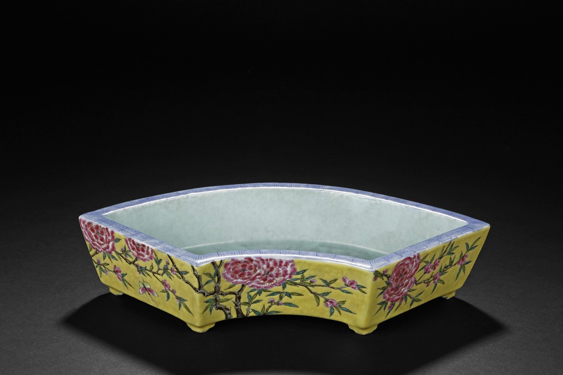 Of curved fan shape, the dish's interior glazed in teal, the sides depict butterflies amidst peony flowers against yellow glaze and crackle patterns, with artist mark'DA YA ZHAI' at center, the bottom with four character mark.