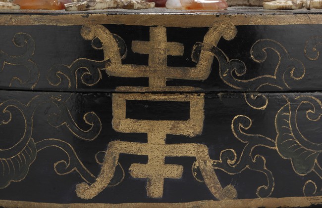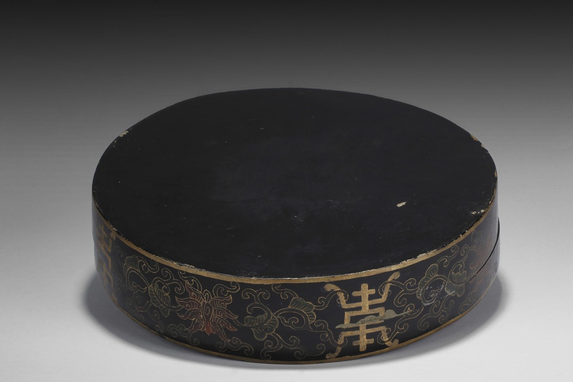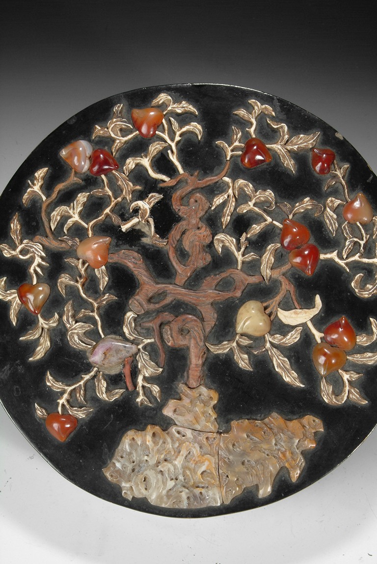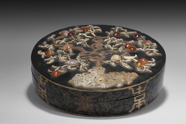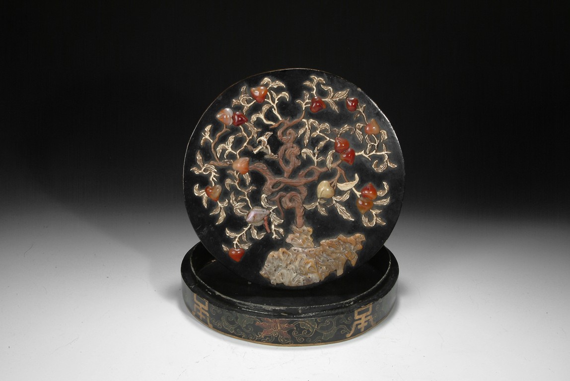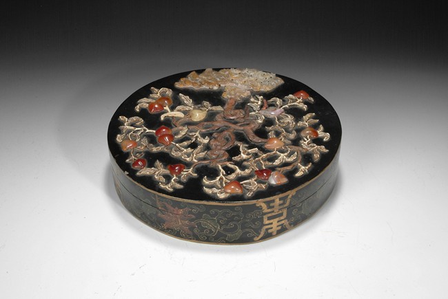 A circular lacquer wood box embellished with Shoushan stone, and agate, depicting a branch of peach tree in the garden setting. Qing Dynasty period. D: 10 1/4 in (26 cm), H: 2 1/2 in (6.2 cm)
