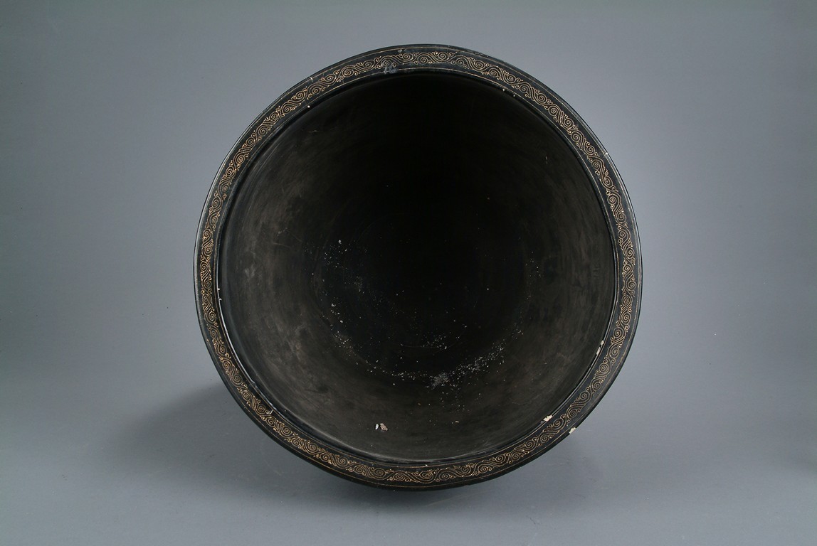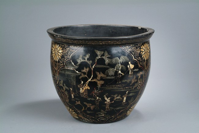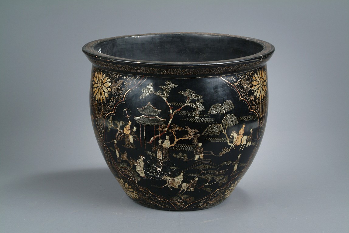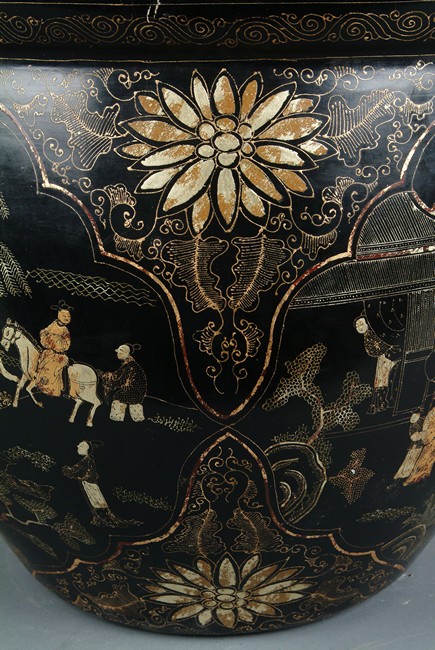 This large jardiniere of bulbous form, finely depicting a group of figural doing different activities, ruyi flowers, key-fret patterns at the rim, gilt lacquer decorated on black color ground, four Chinese character'Kangxi nian zhi' mark on the interior bottom.