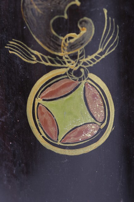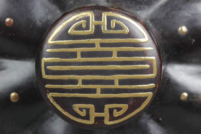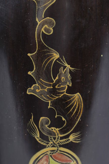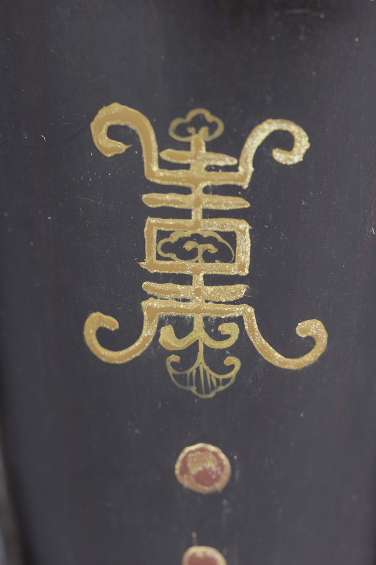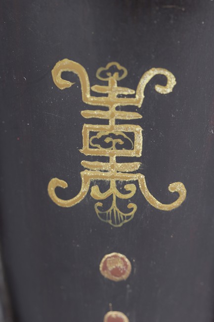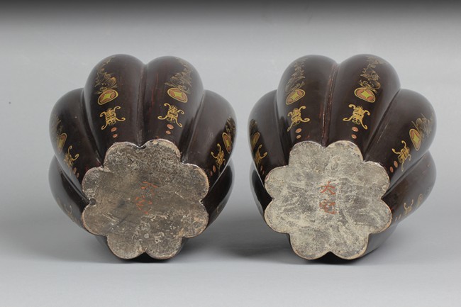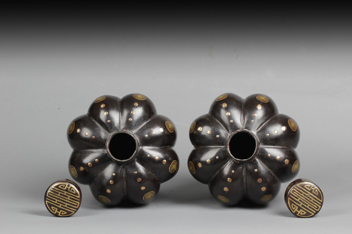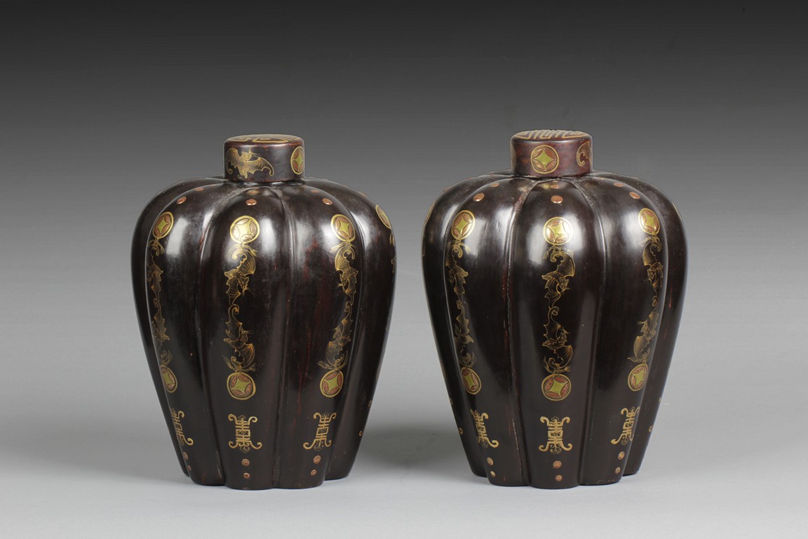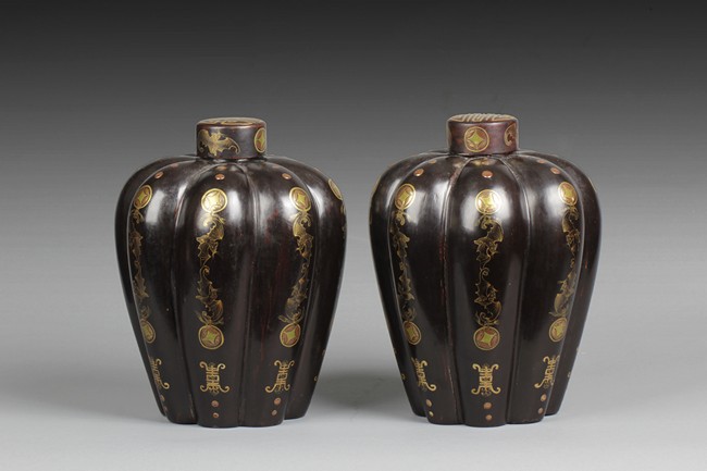 Of tapering ovoid form, with melon-like sections, each gild with flying bats, Chinese coins, and Chinese characters, the cover with similar design gild. Bottom bears two character mark'Dazhai'. Qing Dynasty period.