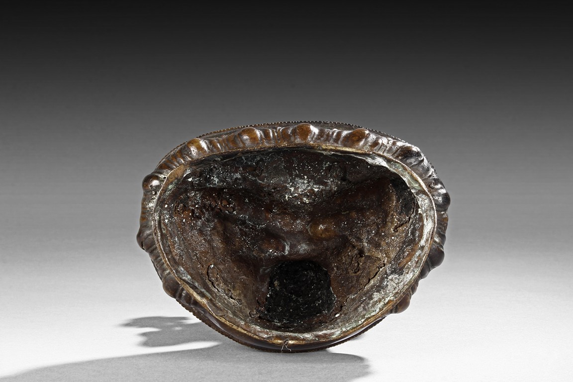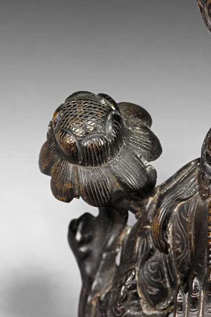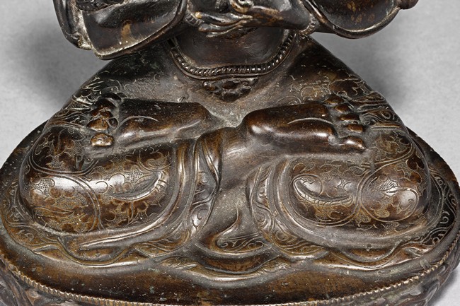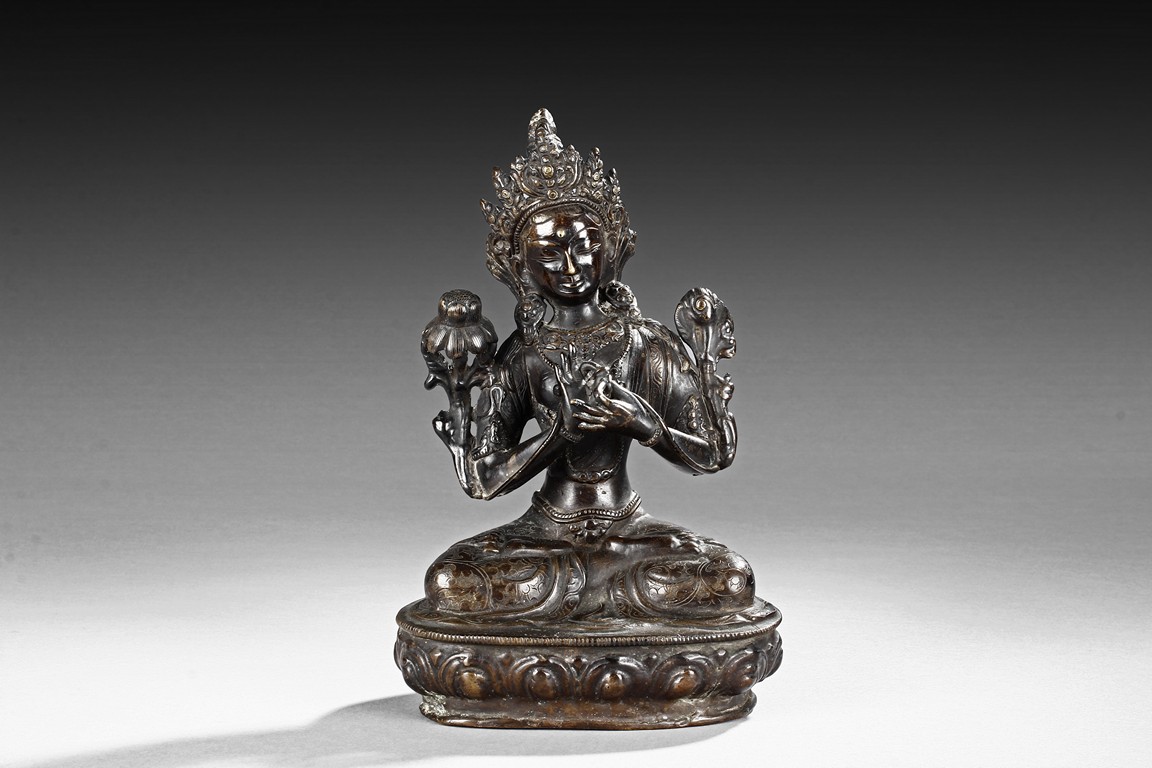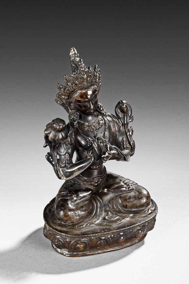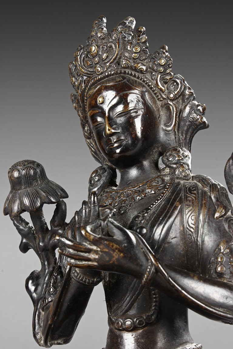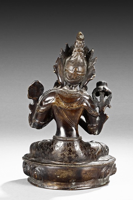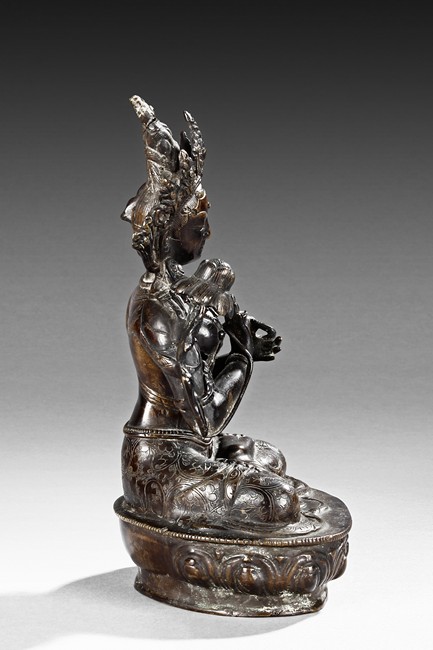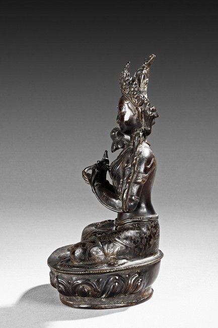Seated in vajrasana on a single lotus stand, the Bodhisattva's hand in dharmacakra mudra and holding the stems of lotus, he is shown wearing dhoti and bejewelled chest and five leaf crown set in front of high chignon, the face with serene expression. Qing Dynasty period.