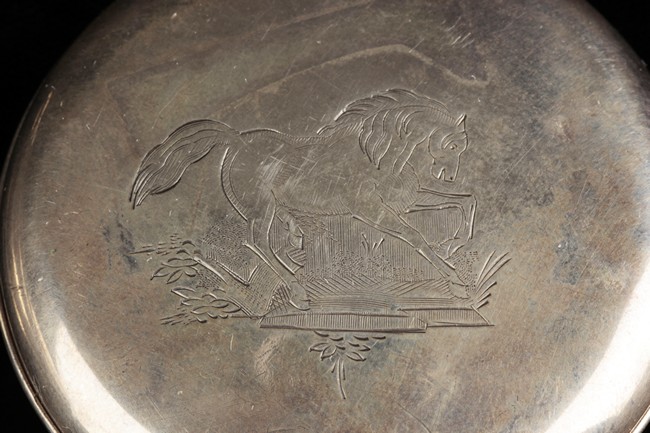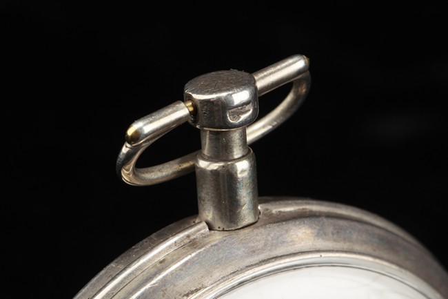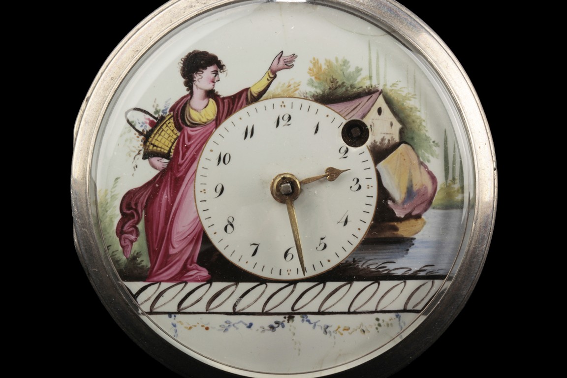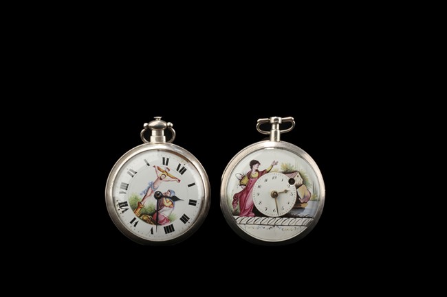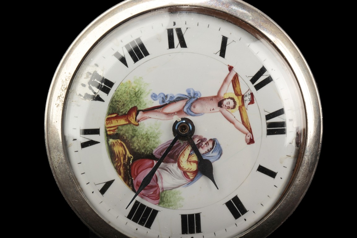 Of circular form, one watch with Jesus on the cross with a praying lady, the other watch with a lady holding flower basket near a house, both made with silver and require manual winding. 18 to 19th century.