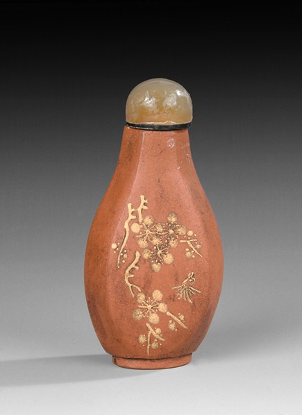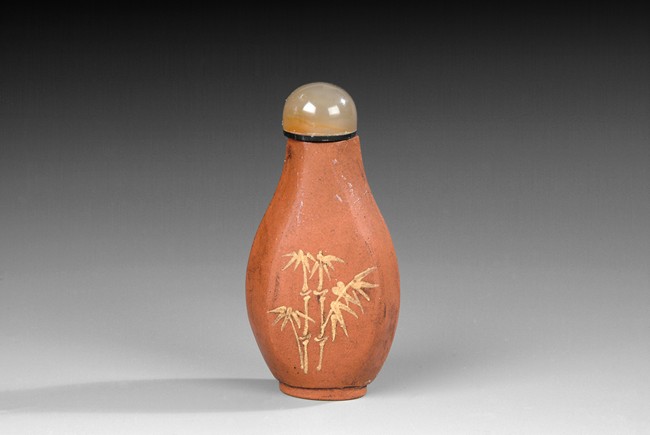 Of rounded and flattened hexagonal form, the bottle is finely painted in beige slip on the brown Zisha stoneware ground with bamboo on one side and chrysanthemum flowers on the reverse. Capped with an agate stopper, and two character'QIANLONG' mark on the bottom.