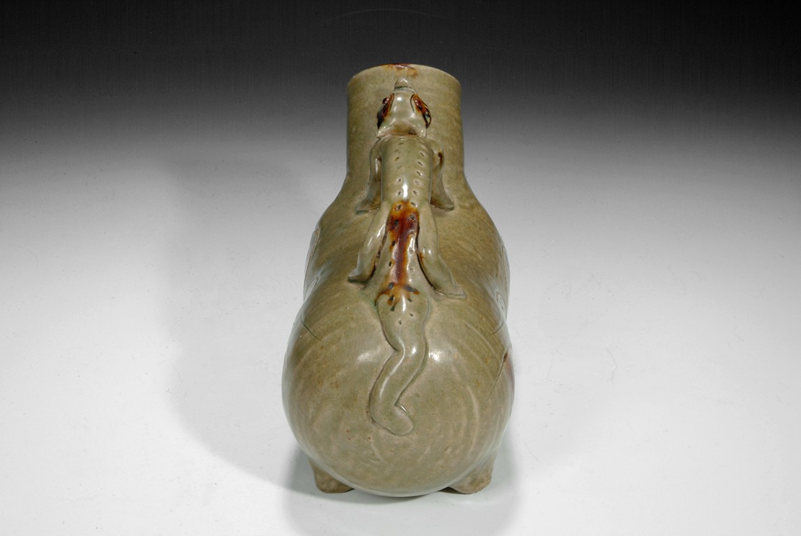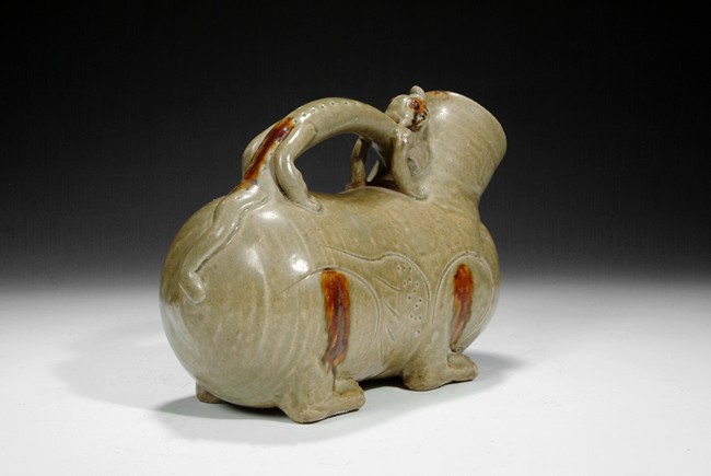 A green glazed urinal in the shape of tiger with a dragon handle on the top. Five Dynasties period.