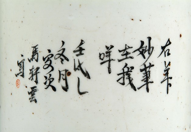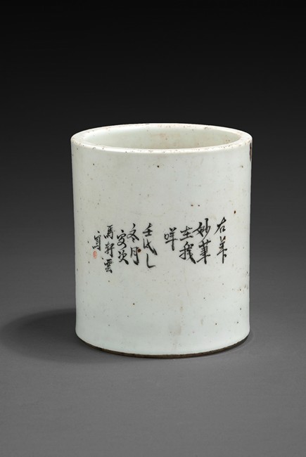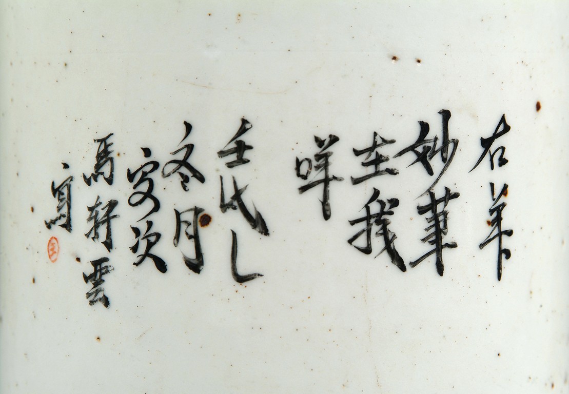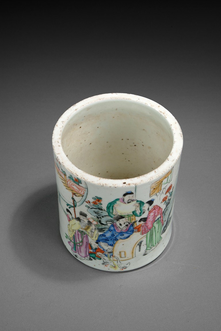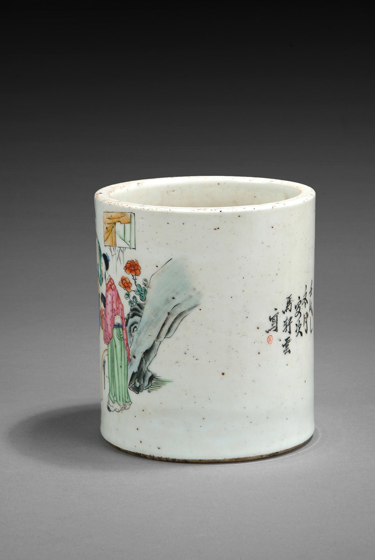 Of cylindrical shape, enameled around the exterior with a scene that depicts a few scholars and a child gathered in a garden setting, a set of calligraphy and artist seal on the back, all reserved on an white ground with a four character'MAYUNXUAN' mark on the bottom. Republic period.