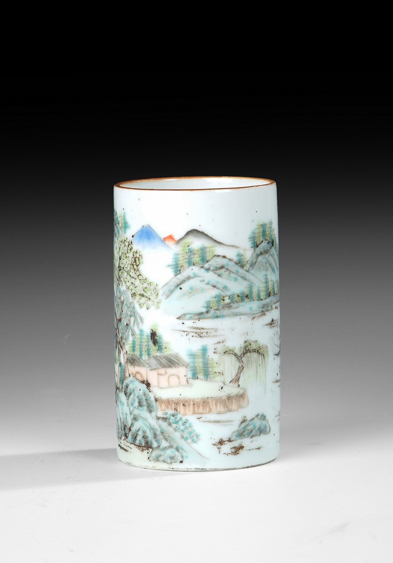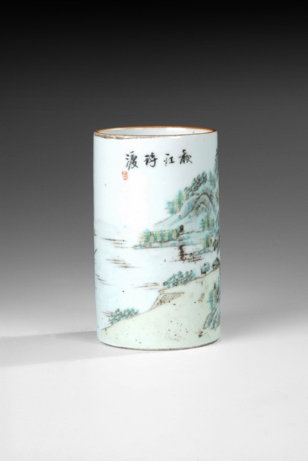 Of cylindrical form, the brush pot depicts a mountain, river, and village scenery, with trees, villagers, and rocks scattered around. Four Chinese characters and artist mark on the top, and four characters'TONGZHI' mark on bottom. Qing Dynasty period.