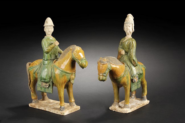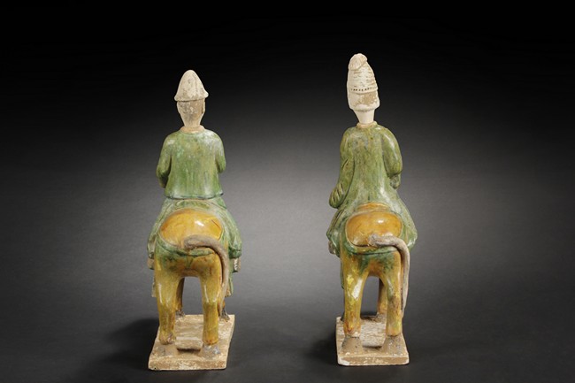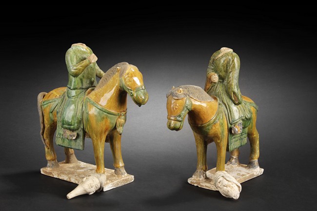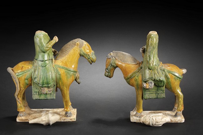 The pair of ceramic figures depict two men riding on horses, each with helmet and robes, and both heads can be removed from the body. 18th century, imitating Song Dynasty ceramics.