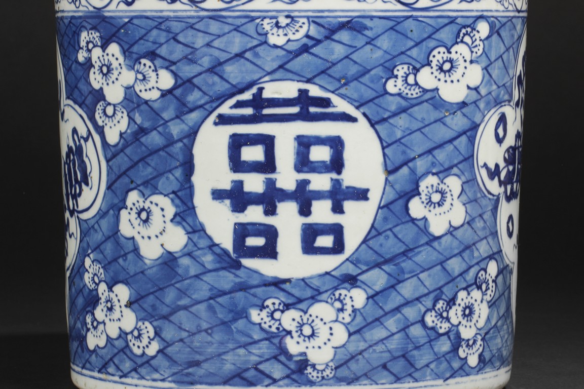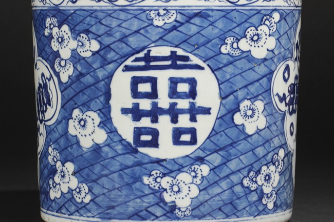 The blue and white brush finely depicts a double happiness in Chinese characters on the body of the pot along with flower blossom and kites flying within a large motif of a flower petal.