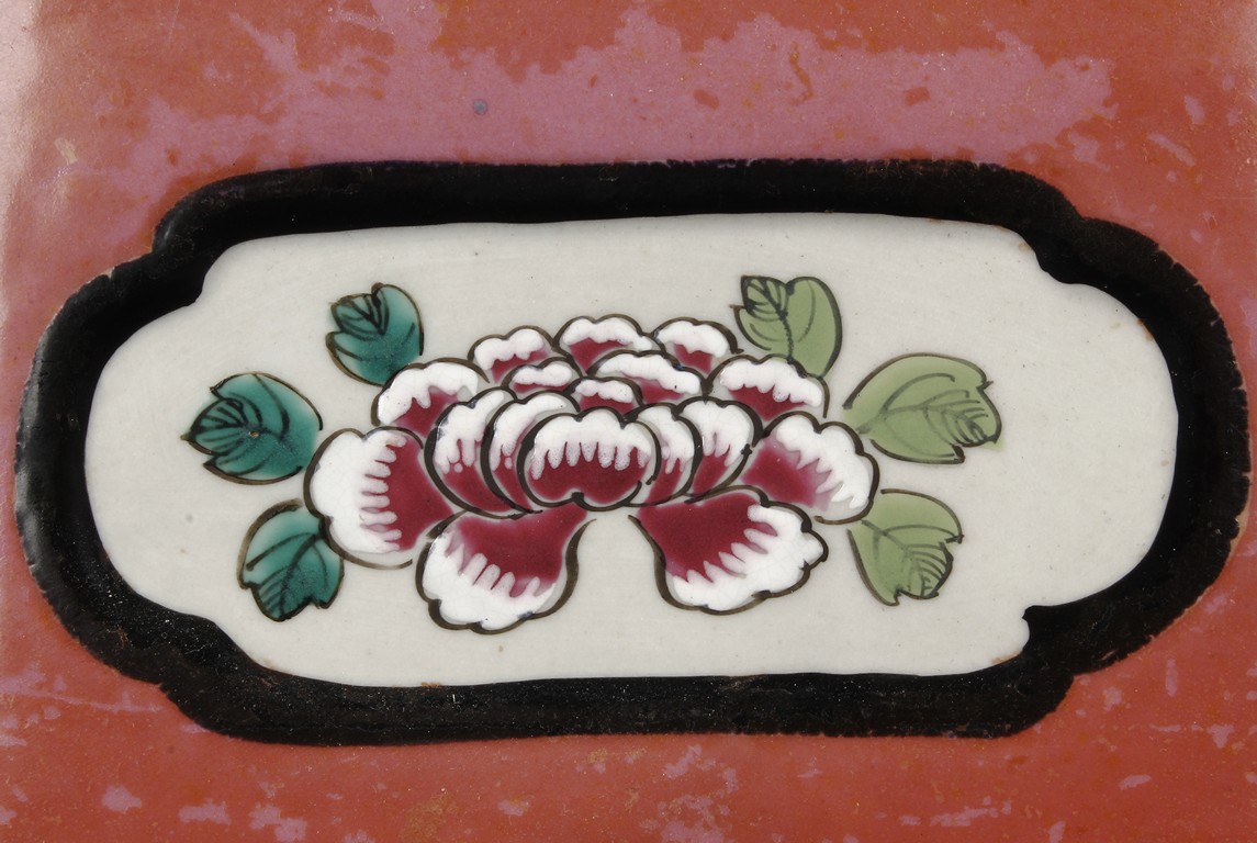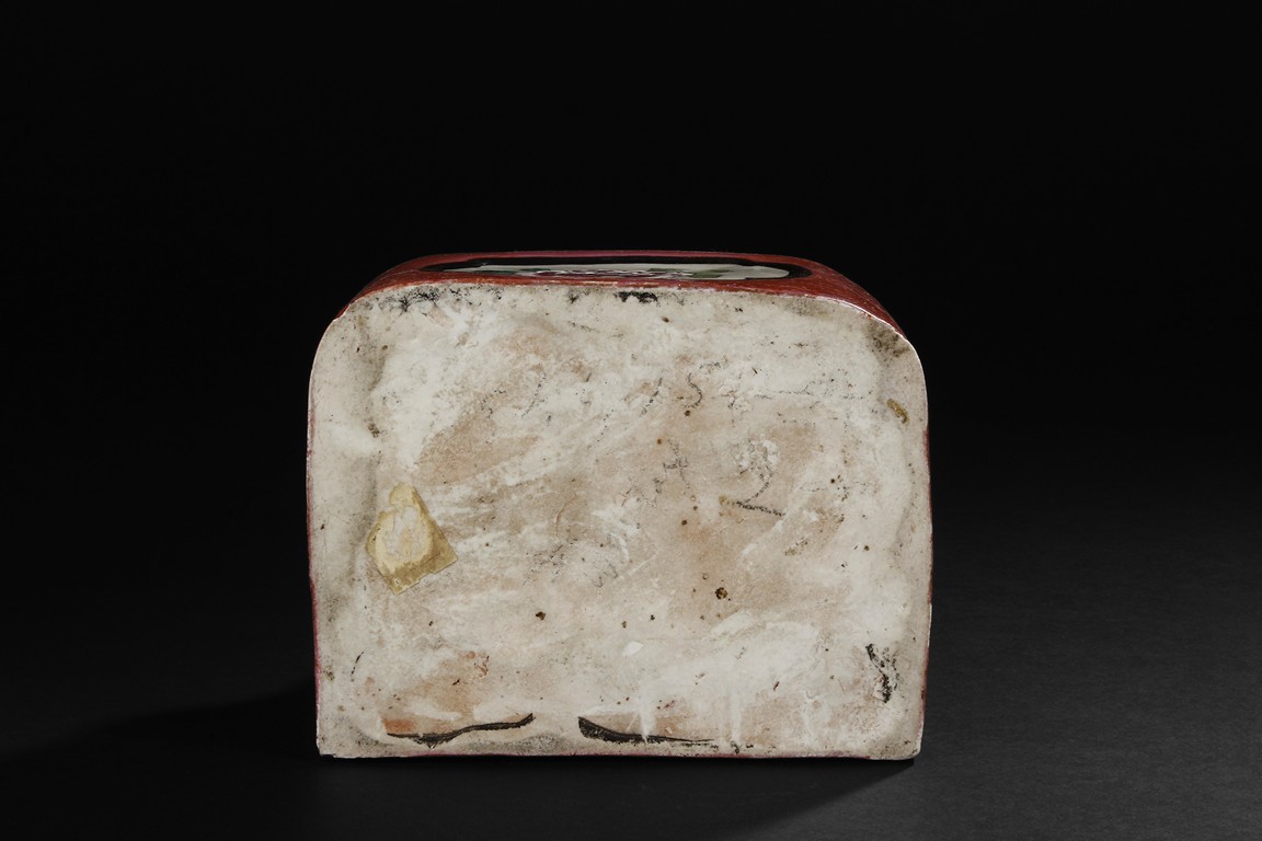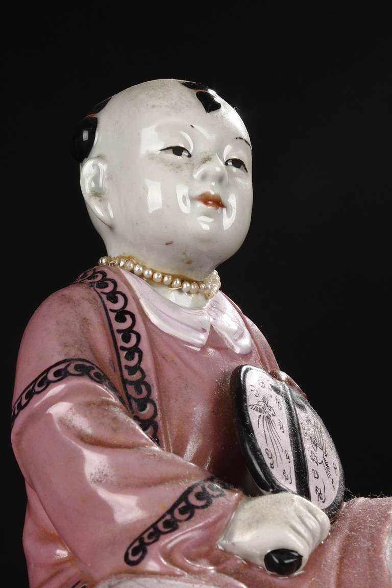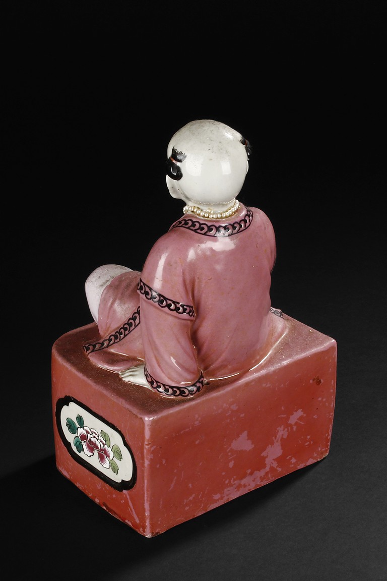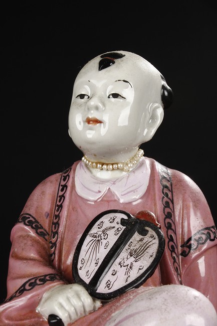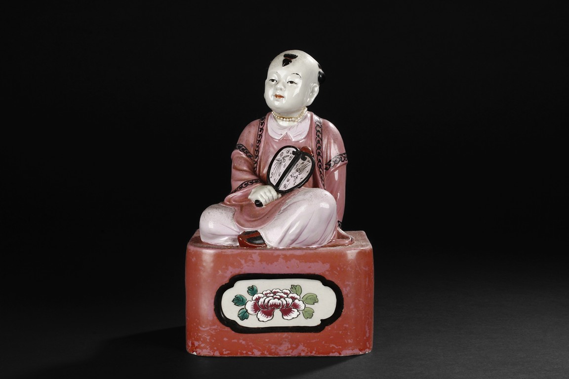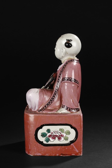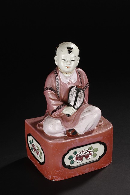 The boy seated on a square red pedestal painted with peony flowers on three sides, wearing traditional robe garments with a fan on hand and pearl necklace around the neck, the bottom remain unglazed. Qing Dynasty period.