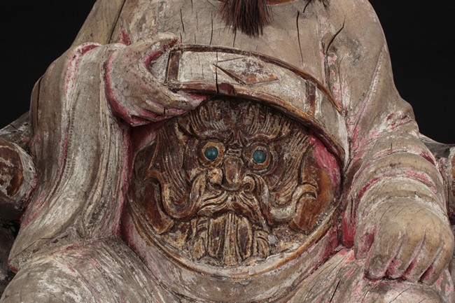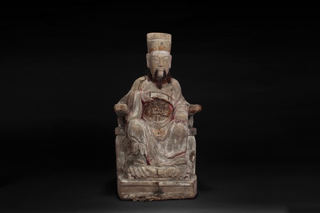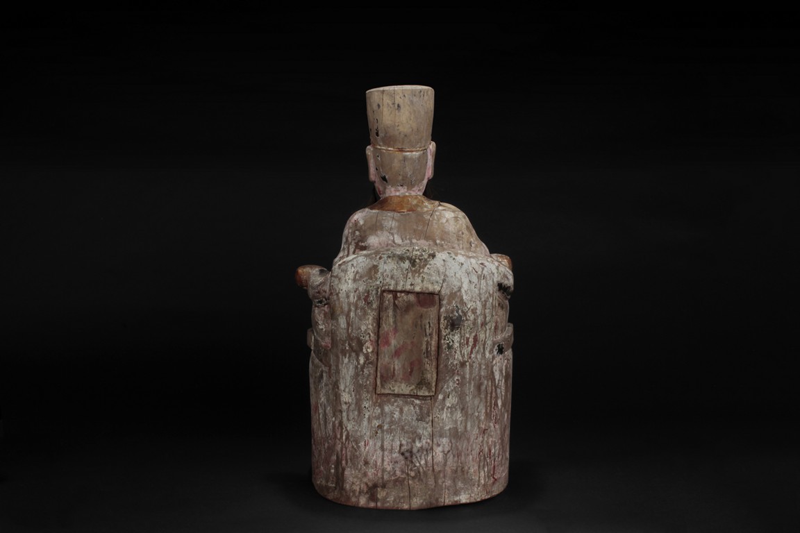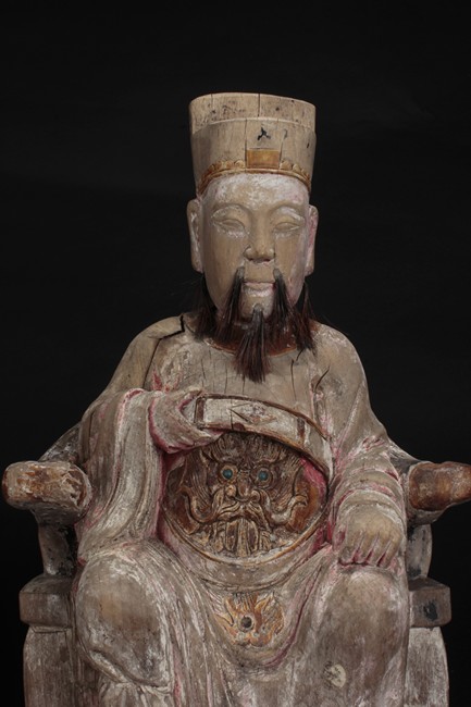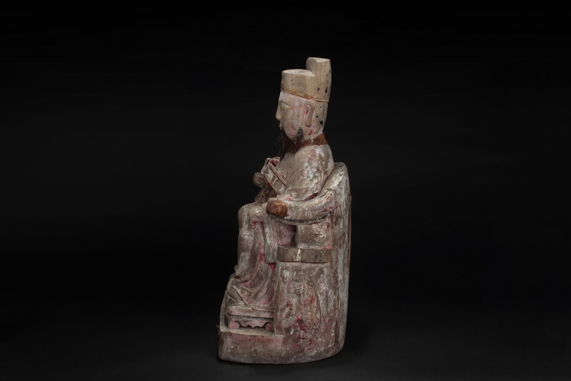 Seated in a throne-like chair, the figure dressed in long robes with a dragon head in the center and secured by two belts above and below the waist, his face with intent gaze and long beard, remnants of original paint. Age related loss of color and cracks. Qing Dynasty period.