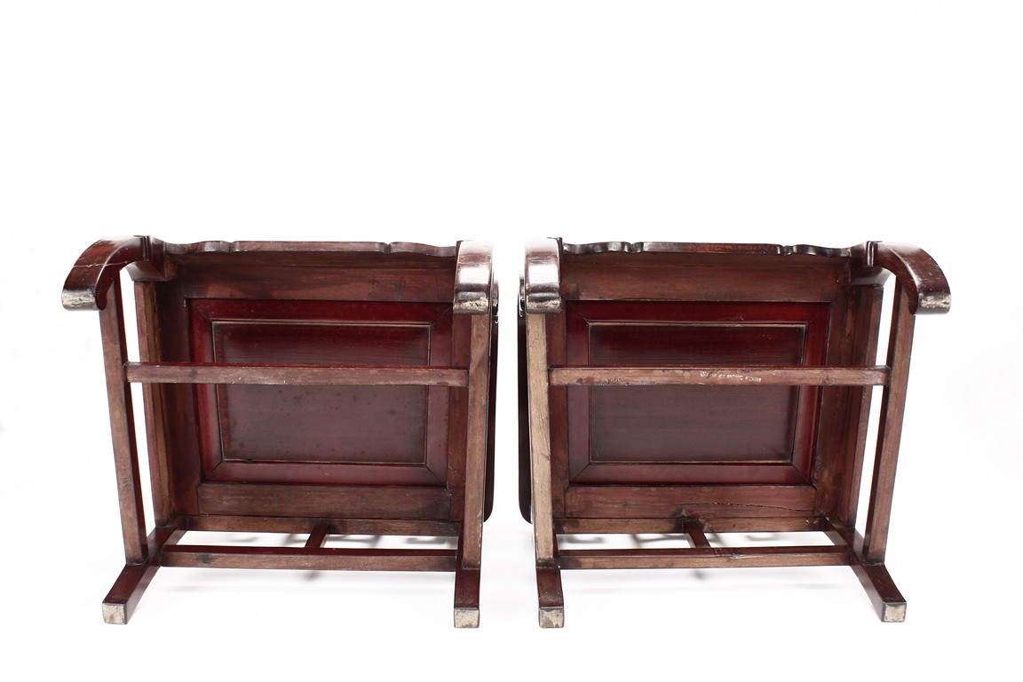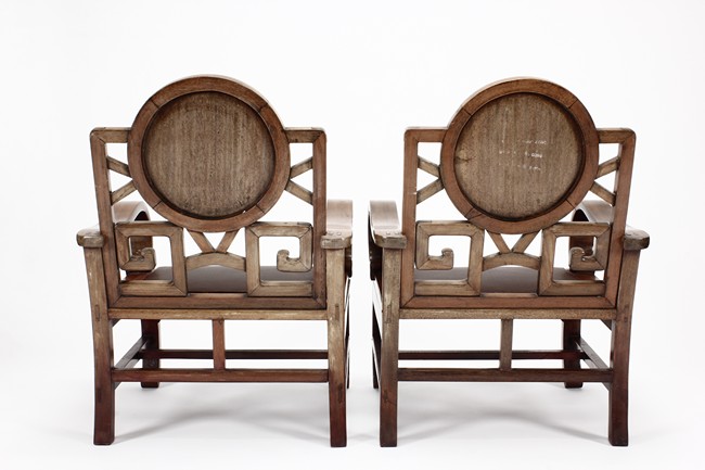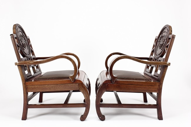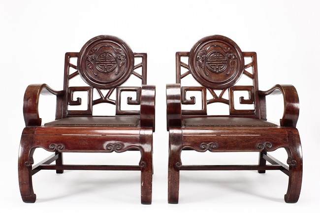 The two chairs made from hongmu wood, with wide armrests connected to the openworks carved back rest depicting two flying bats enclosing'Shou' character, border carved with scrolling key-fret patterns, the seats padded slightly, the four hoofed legs linked by underside stretchers. Republic period