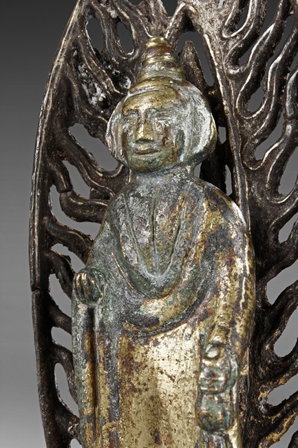 The slender figure is shown standing with right hand raised and left hand pendant while standing in front of a flame-shaped mandorla on top of the openwork base with four legs. 16th century, Kingdom of Dali.