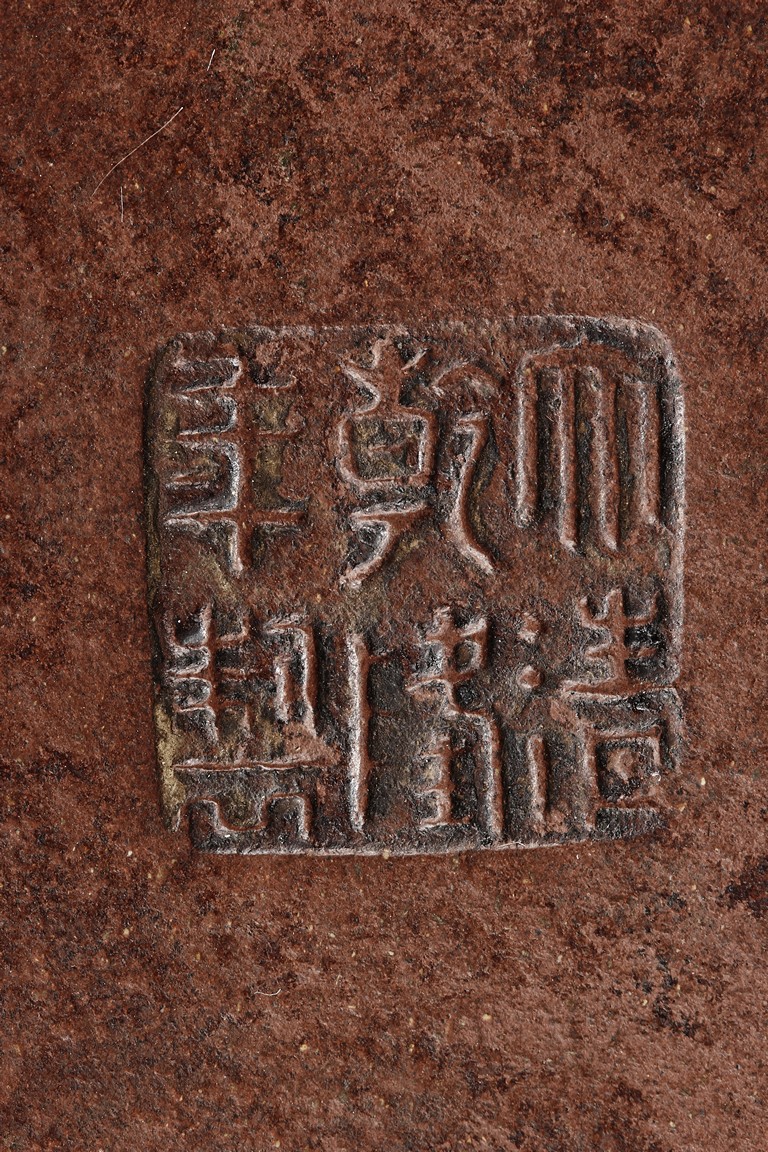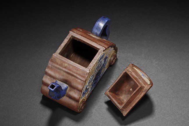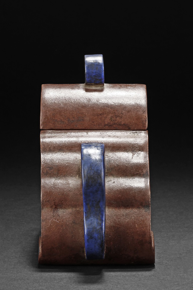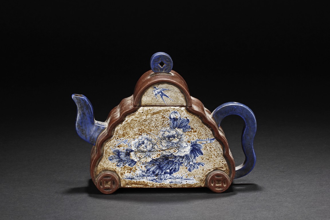 The body of teapot shaped in the form of a mountain, with layered sides, both sides painted in blue and white with peony flowers and swallows, the handle, spout, and finial painted in blue, and bottom bears six character'DAQING QIANLONG NIANZHI' mark.