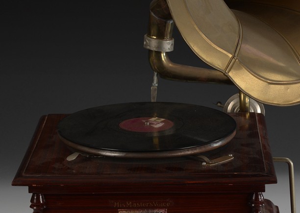 The phonograph constructed with square wooden base, with the turn table on the surface, and floriform speaker, the base with'His Master's Voice' label, by'The Gramophone Company Ltd'.