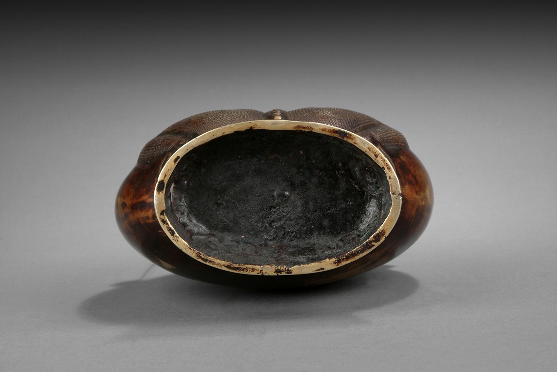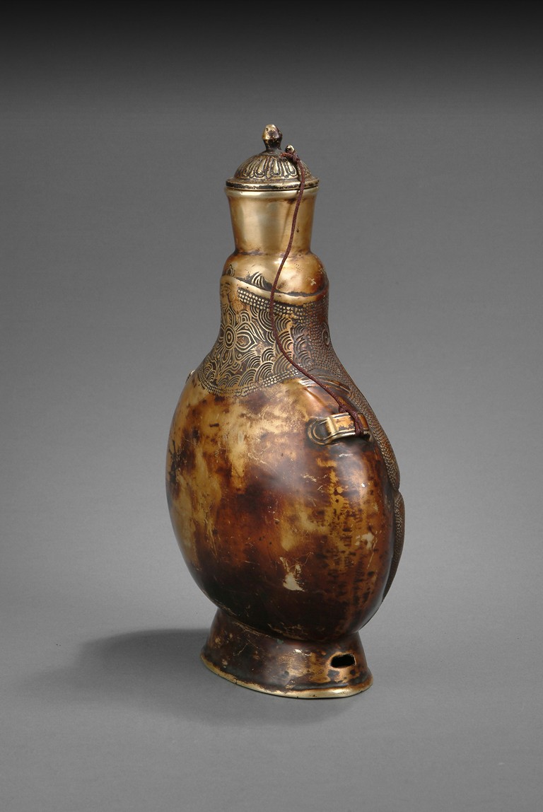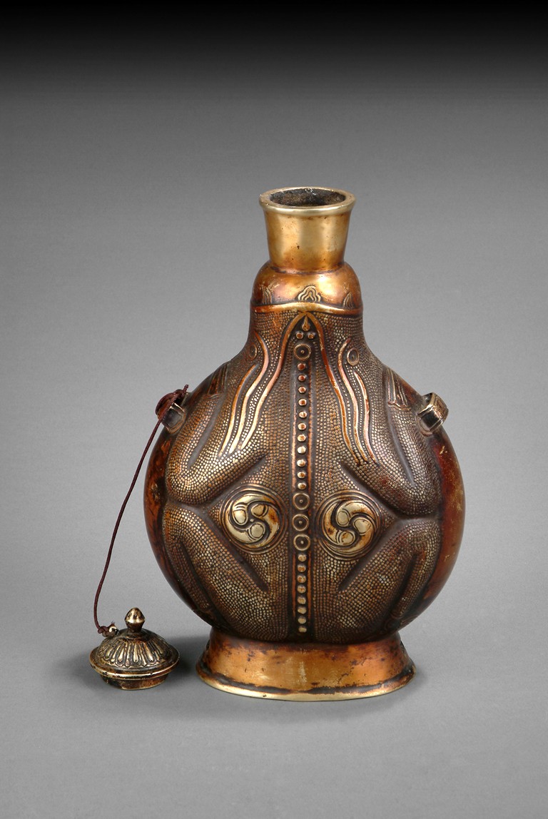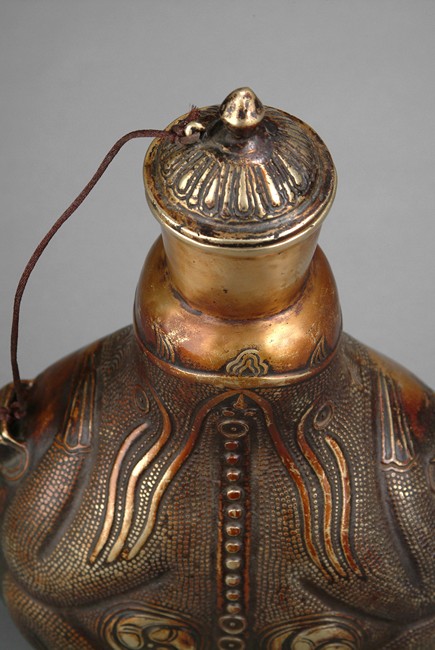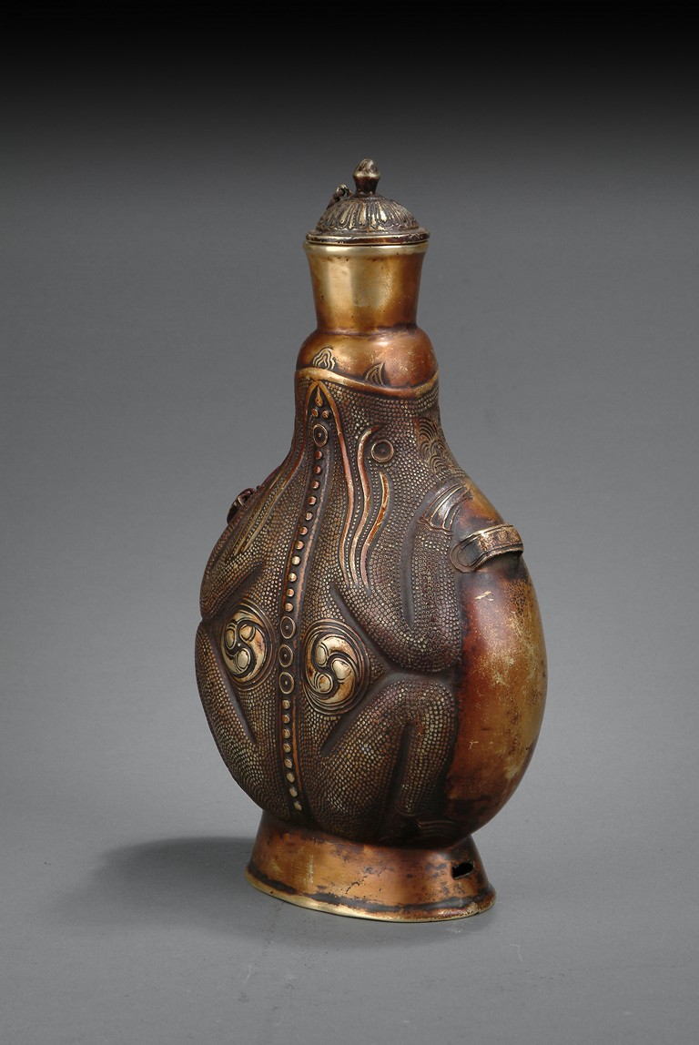 Of flattened ovoid form, the unusual bottle stands on high ring foot, rise to a dotted surface with Taichi marks, two small handles on the side, with a stringed cover on top. 18th/19th century.