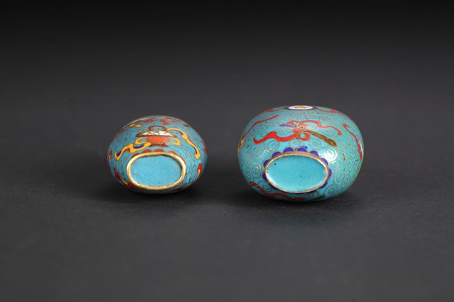 One snuff bottle of long oval shape with coral stopper, the other snuff bottle of flattened oval shape, with a purple stone stopper. Both snuff bottles depict the Eight Treasures on its body, amidst cloud or circular patterns.
