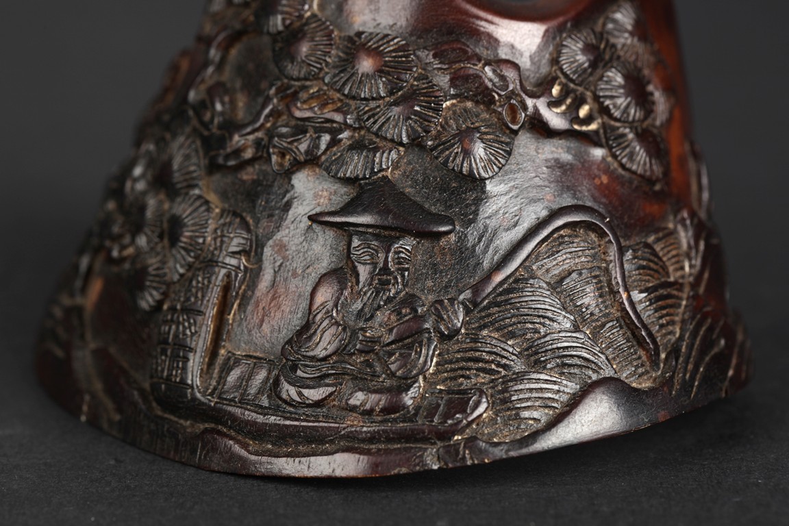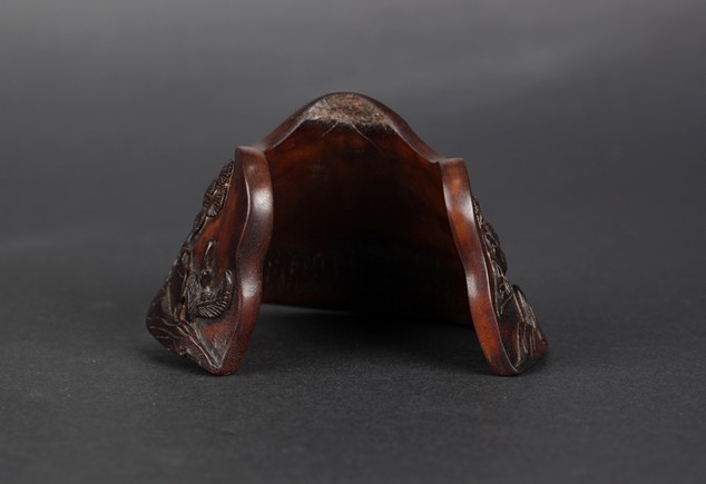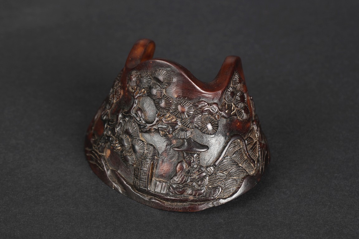 A brush holder carved from horse hoof, depicting an old man fishing under a tree next to a river. The carved scene also includes pine trees, cranes, river, and bow. Qing Dynasty Period
