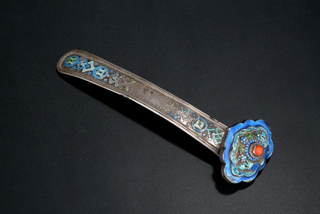 The head and handle are of separate parts, handle depicts fortune patterns, while head depicts cloud, flowers and plants, decorated with a coral. Some loss of color on the handle. Qing Dynasty period.