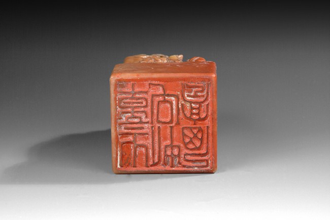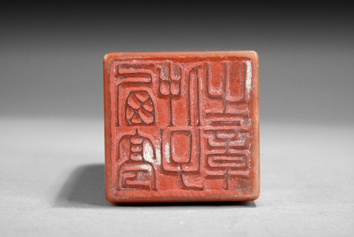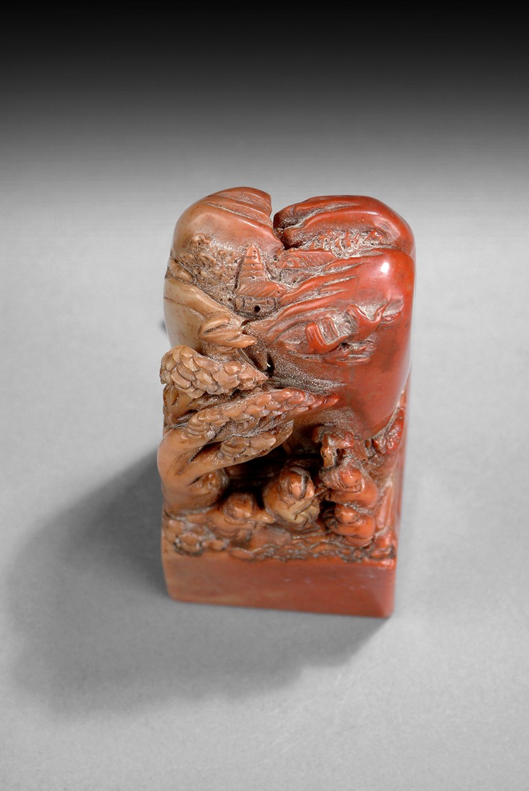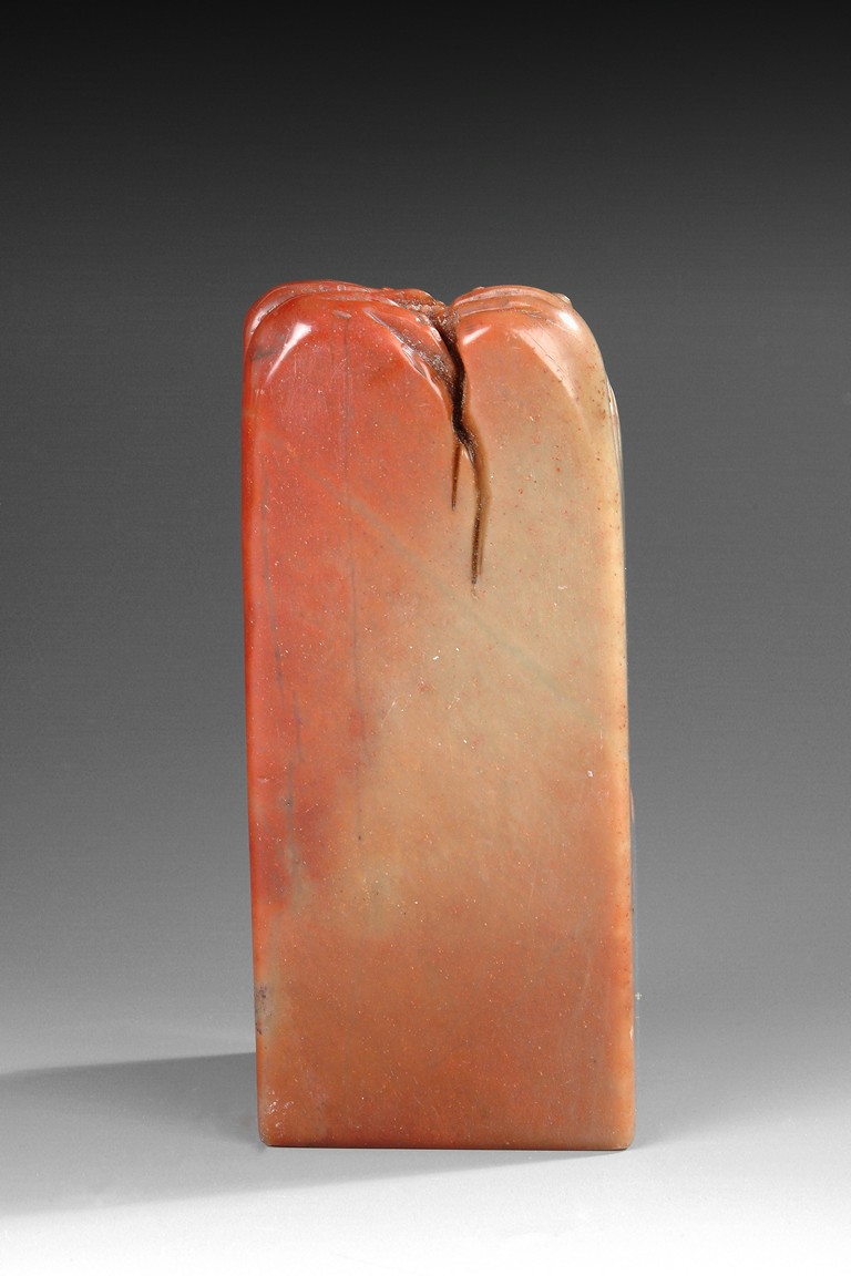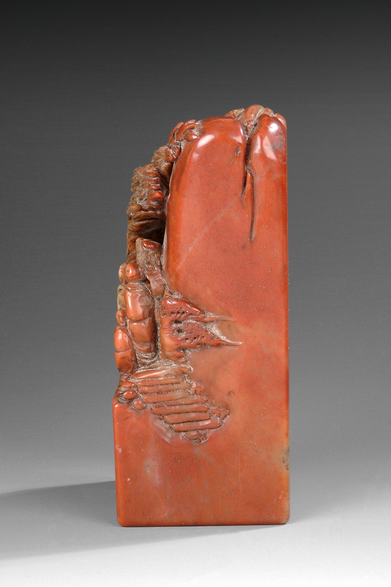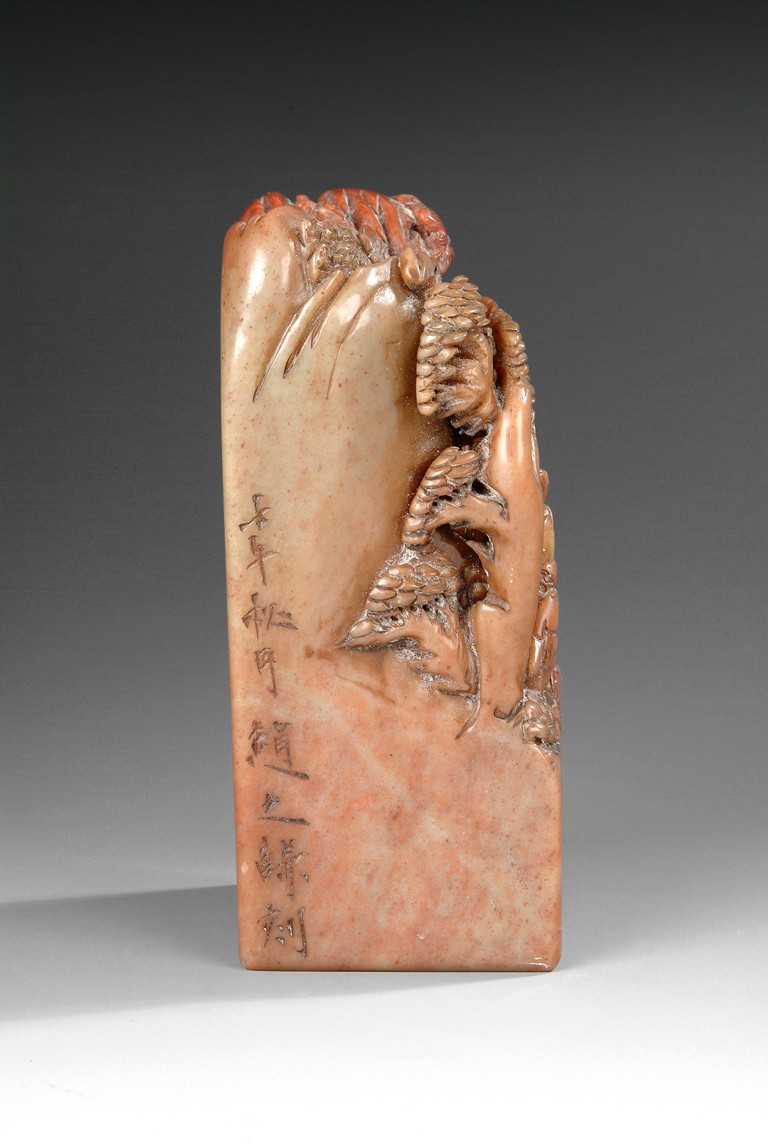 Of rectangular form, the upper front section finely carved with two elders and two attendants climbing the mountain path beneath pine trees.The side carved with artist mark'ZHAO ZHIQIAN', and base carved with six Chinese characters.