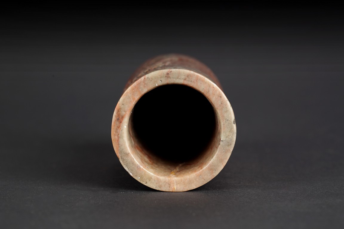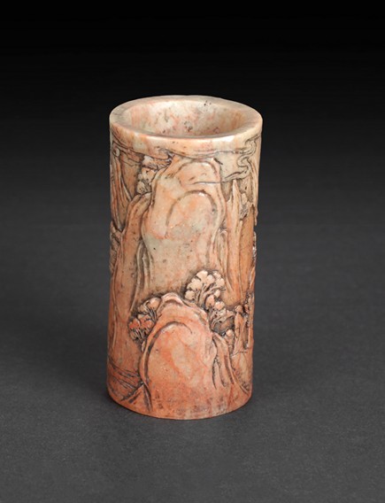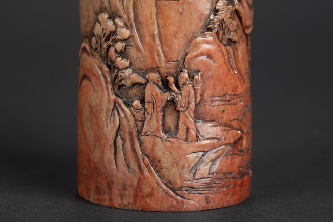 A SHOUSHAN SOAPSTONE CARVED BRUSH POT    壽山石雕二翁深山聚會筆筒