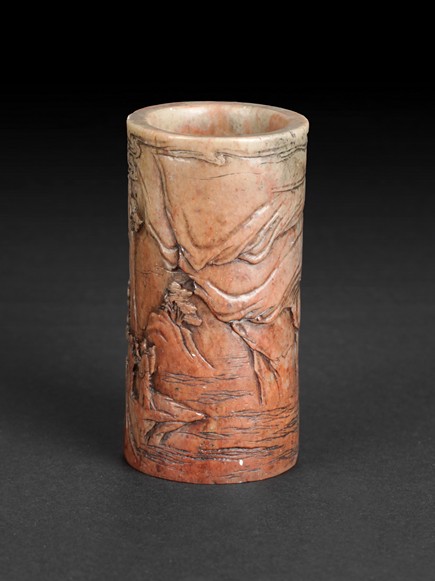 Of cylindrical shape, the brush pot carved with two elders and a young boy meeting in mountain setting, with rivers, trees, and pavillions nearby.